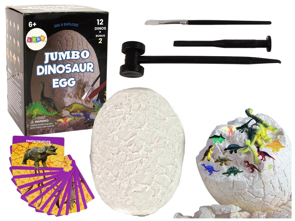 Obrovské vejce ukrývá 12 figurek dinosaurů, kartičky umožní určit druhy a zadní popis upozorní na spoustu užitečných informací. Vezměte do ruky nářadí a staňte se objeviteli!