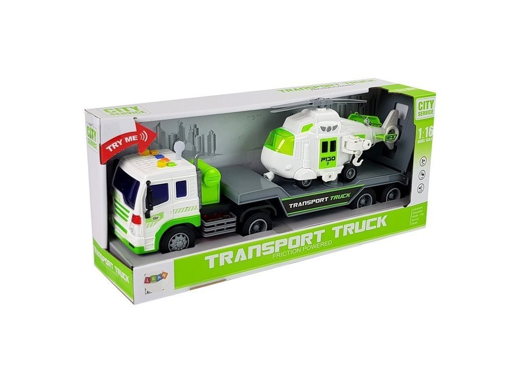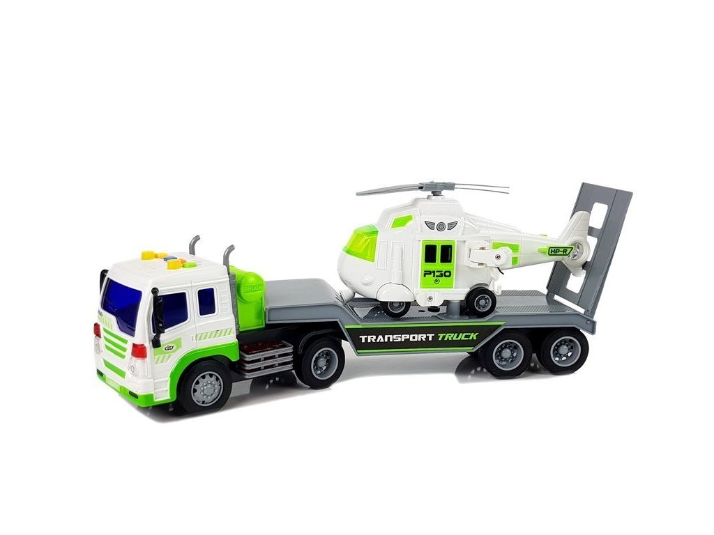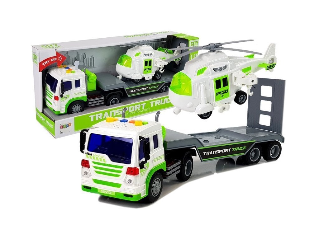 Náklaďák je bílý s dlouhým šedým přívěsem, na kterém můžete převážet vrtulník nebo jiná vozidla. Otevírací rampa v zadní části umožní vrtulníku volně nastoupit, nebo být upevněn na přívěsu. Výhodou vozidla jsou zvukové a světelné efekty. Vyrobeno s velkou přesností a pečlivostí v měřítku 1:16.