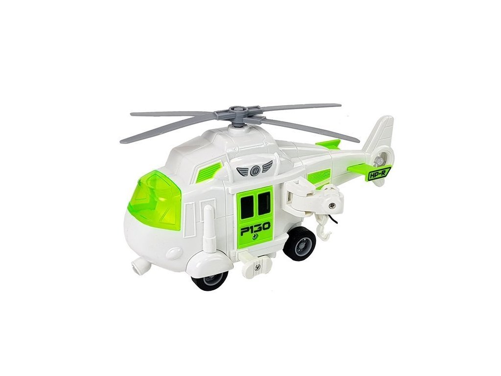 Vrtulník má čtyři namontovaná kola, takže ho můžete nechat pohybovat po podlaze. Bonusem je hák, který lze díky klice spustit a převážet tak předměty z místa na místo. Součástí sady je také malý košík s kolečkem, o který lze hák zaháknout.