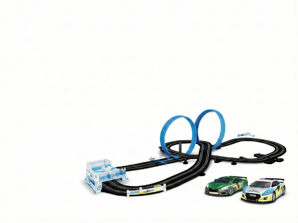 Dráha nabízí smyčky, zatáčky a různé možnosti sestavení, což zaručí, že každá jízda bude jiná. Ovládání je snadné díky ručním ovladačům s funkcí Turbo, které vám umožní vyzkoušet maximální rychlost na rovinkách i v ostrých zatáčkách. Perfektní zábava pro 2 hráče, která trénuje postřeh, rychlé reakce a přináší napětí jako ve skutečných závodech.