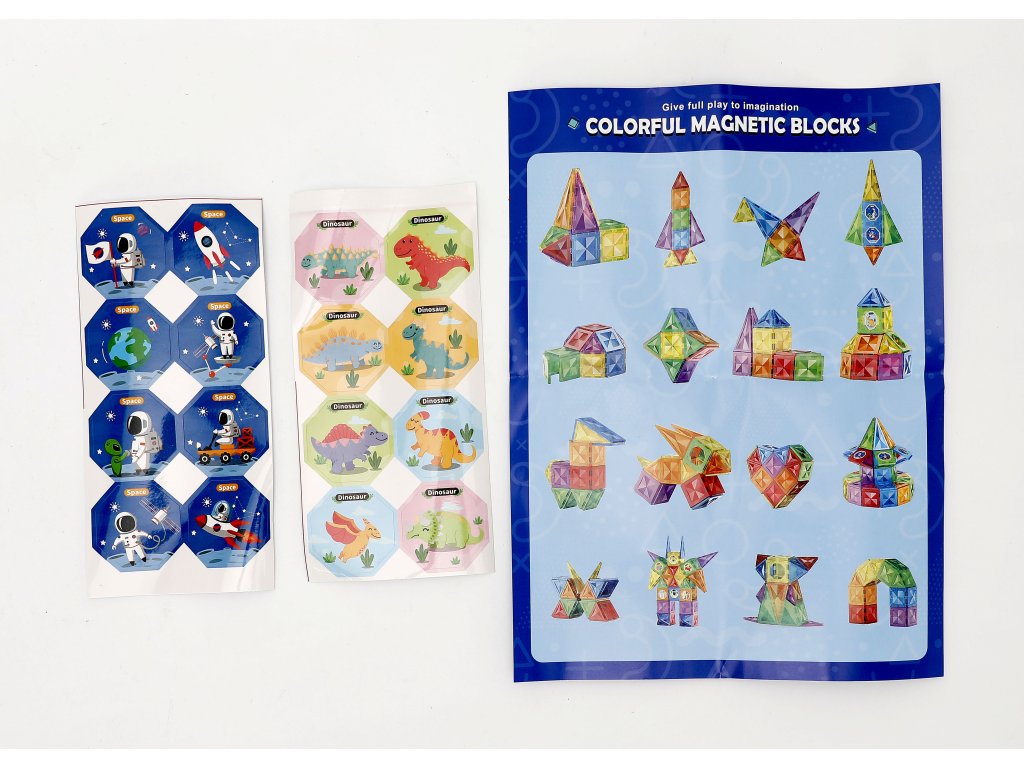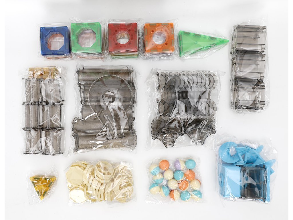 - Obsahuje: magnetické bloky různých tvarů, díly kuličkové dráhy, kuličky, samolepky, návod