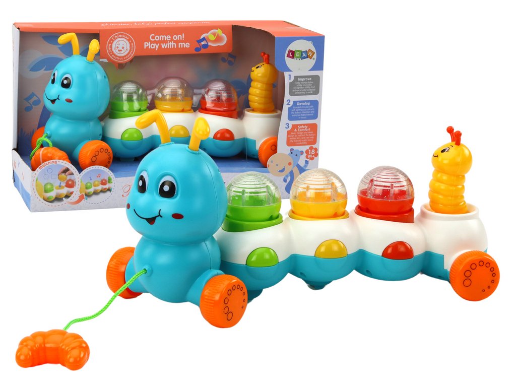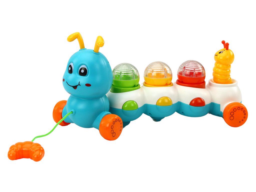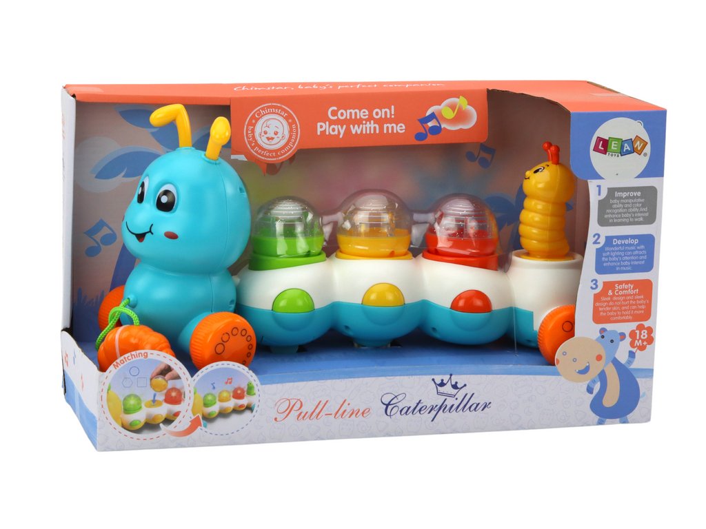 Housenka je vybavena kolečky a provázkem, což umožňuje dítěti začít si hrát s tahací hračkou a zároveň poslouchat veselé melodie. To není jenom skvělá sluchová stimulace, ale také rozvoj motorických dovedností díky tahání a vedení housenky.