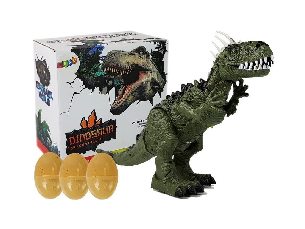 Sada obsahuje 3 kusy vajíček, prohoďte je otvorem na zadní straně a sledujte, jak jsou vajíčka snesena při pohybu. Po zapnutí plaza se zobrazí fotka skutečného tyranosaura s pomocí projektoru.