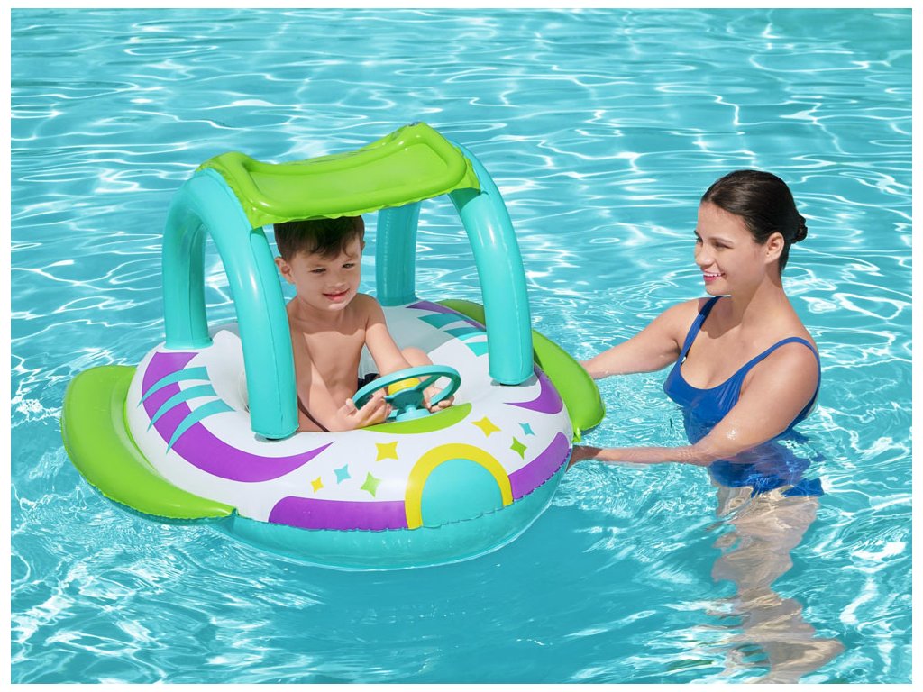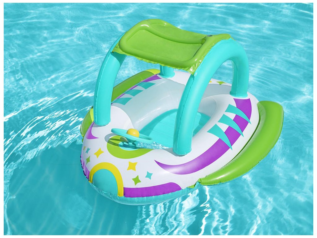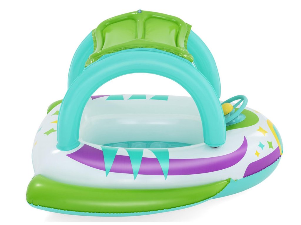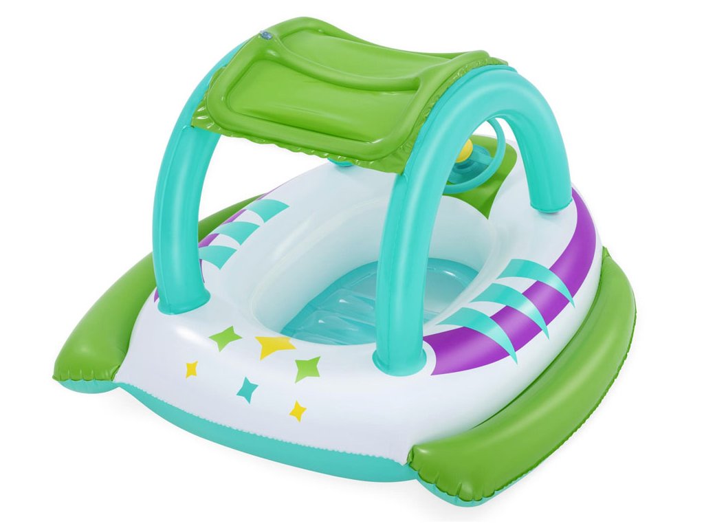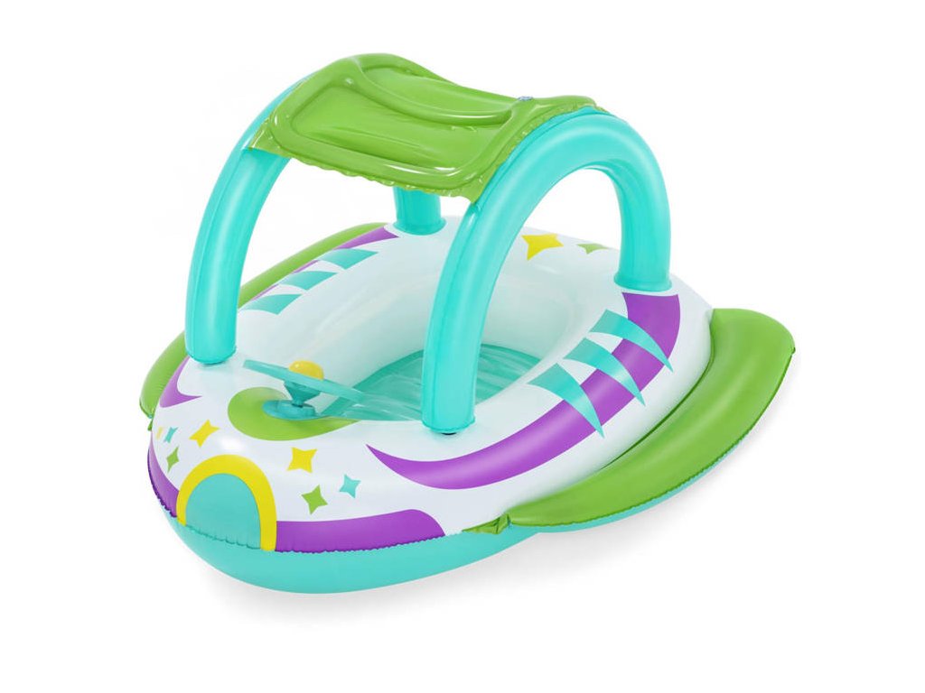 Nafukovací člun s baldachýnem a barevnou vesmírnou grafikou je nabídkou od společnosti Bestway® Space Splash™ pro děti od 3 let. Člun byl vytvořen speciálně pro děti, které teprve začínají s vodou a ještě nemohou být ve vodě samy.