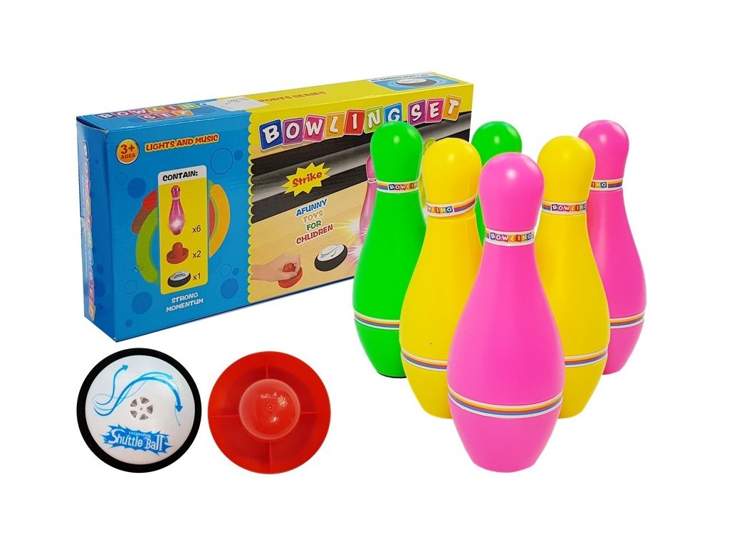 Bowlingová sada je určena pro děti starší 3 let. Hračka obsahuje 8 baterií AG13, nachází se pod diskem a každou bowlingovou kuželkou.