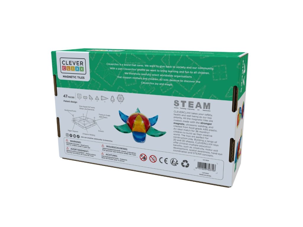 - Kompatibilní s většinou magnetických stavebnic (Cleverclixx, Connetix, Magna Tiles, Coblo)