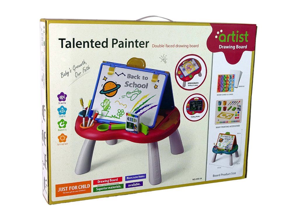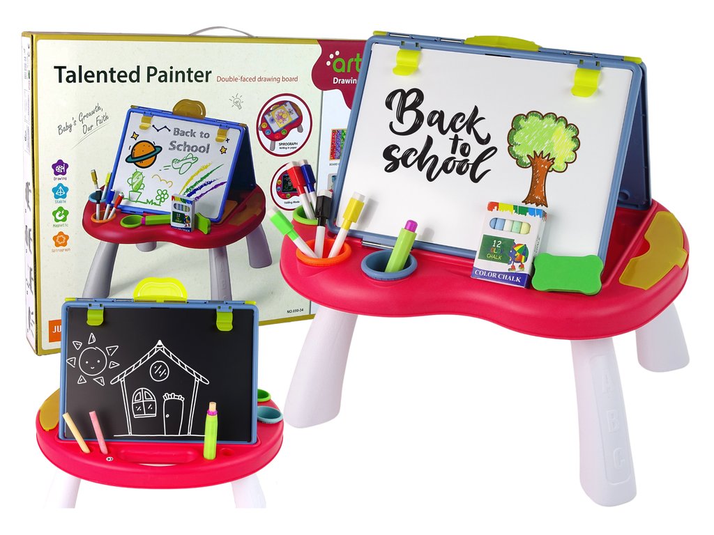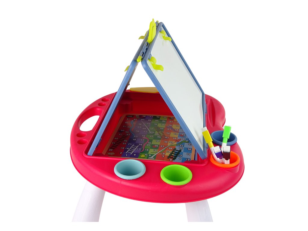 Mnoho možností v jedné hračce! Malý umělec bude moci vytvářet vlastní obrázky, rozvíjet umělecké dovednosti a bavit se. Tabule má dva povrchy pro kreslení - bílý povrch pro použití stíratelných fixů a černý povrch pro kreslení křídami. Odkládací plocha pod tabulí slouží k odkládání příslušenství, kulaté otvory budou ideální pro fixy a křídy. Jeho druhé využití je jako herní plocha, součástí jsou dvě hrací desky (Hadi a Člověče nezlob se).
