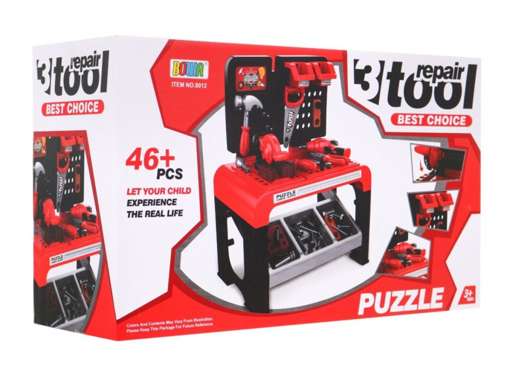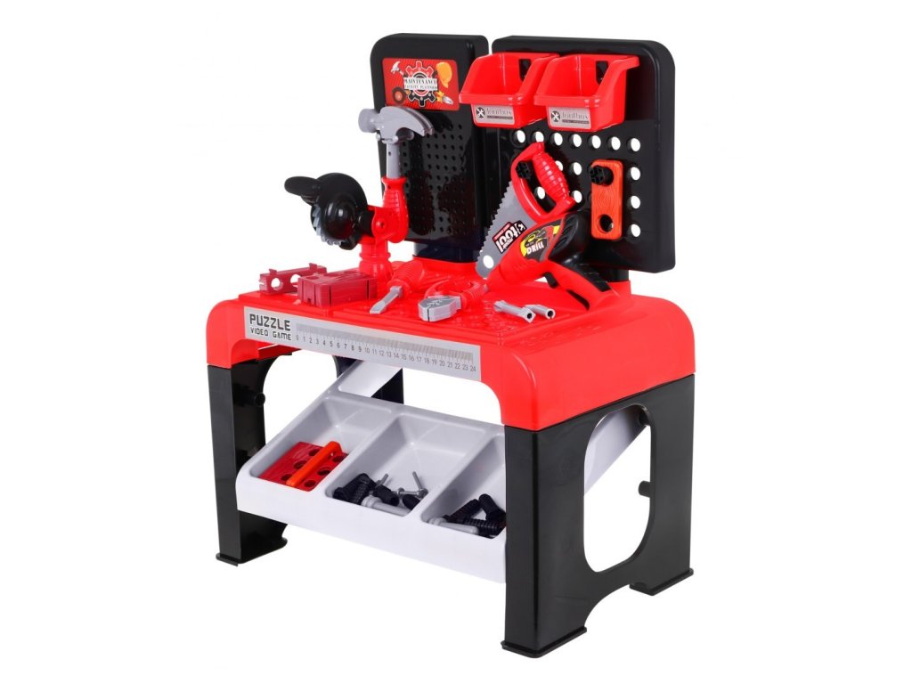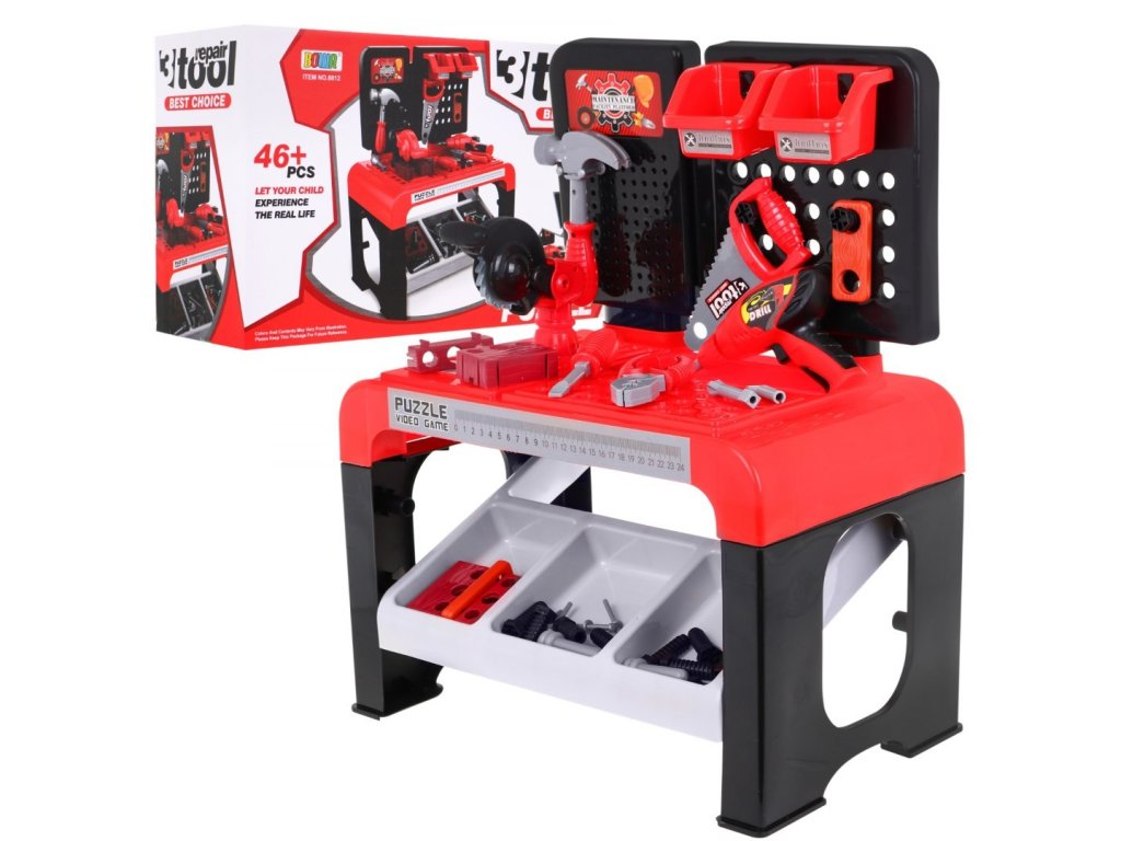 Dětská dílna s nářadím je pro malé kutily od 3 let. Sada se skládá z pracovního stolu a nářadí. Pracovní stůl je vybaven poličkou na nářadí. Na stěně a desce stolu jsou otvory, kam lze přišroubovat šrouby.