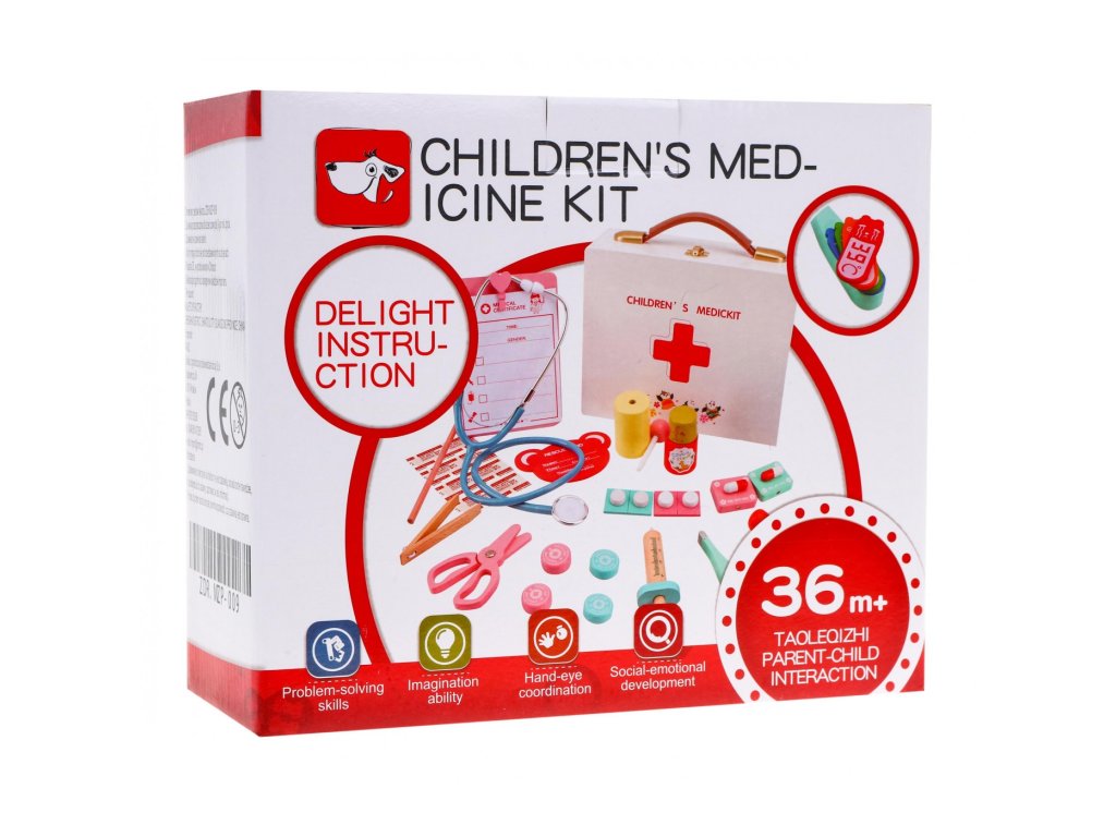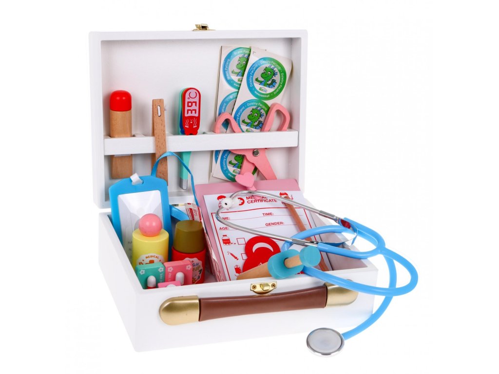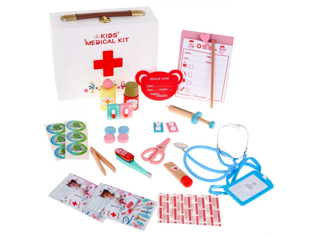 Dětská dřevěná lékařská sada se osvědčí v mnoha nouzových situacích. Dobře vybavená lékárnička je užitečná při léčbě plyšových medvídků, panenek i členů rodiny. Hra s touto sadou zajistí mnoho legrace a také dítěti umožní překonat strach z návštěvy lékaře. Barevné lékařské doplňky jsou vyrobeny ze dřeva. Vše je zabaleno v dřevěným kufříku s praktickým uchem.