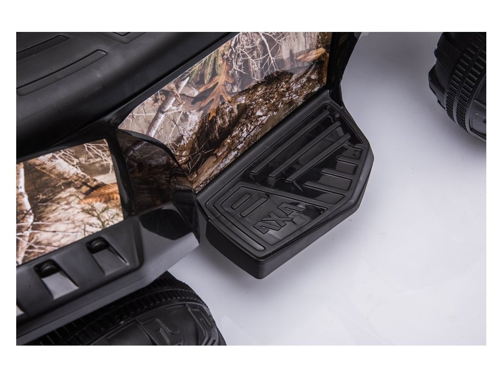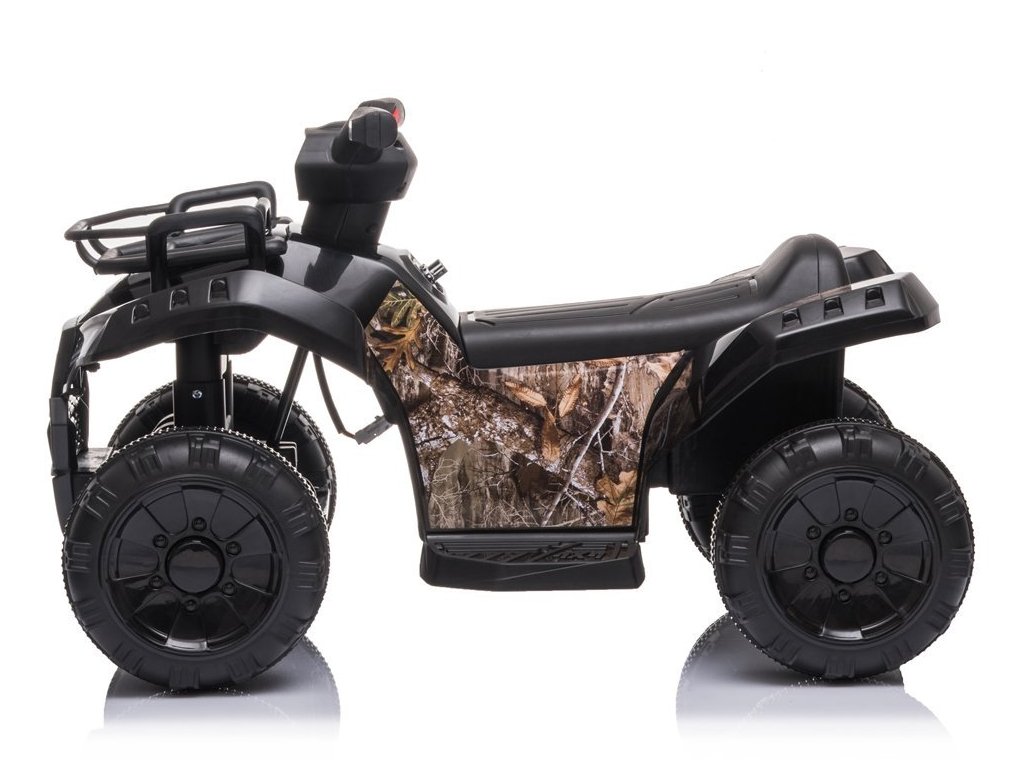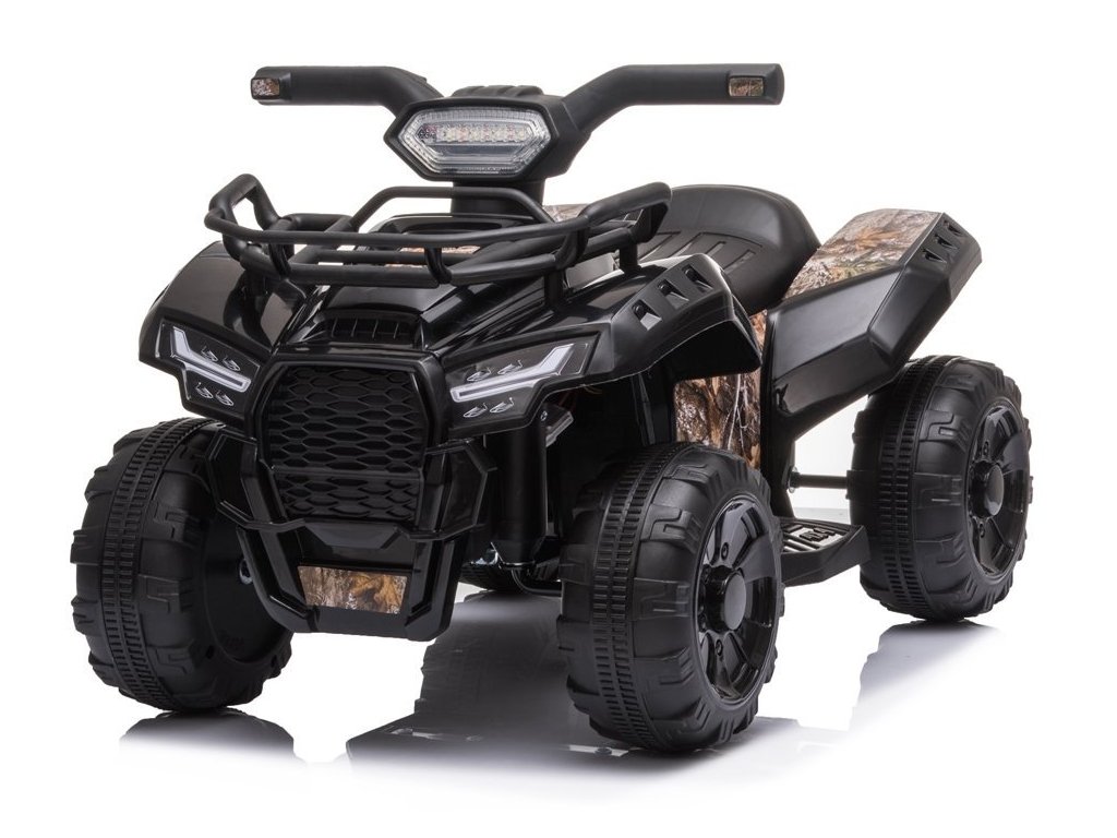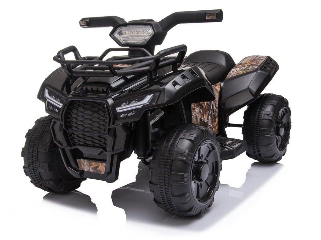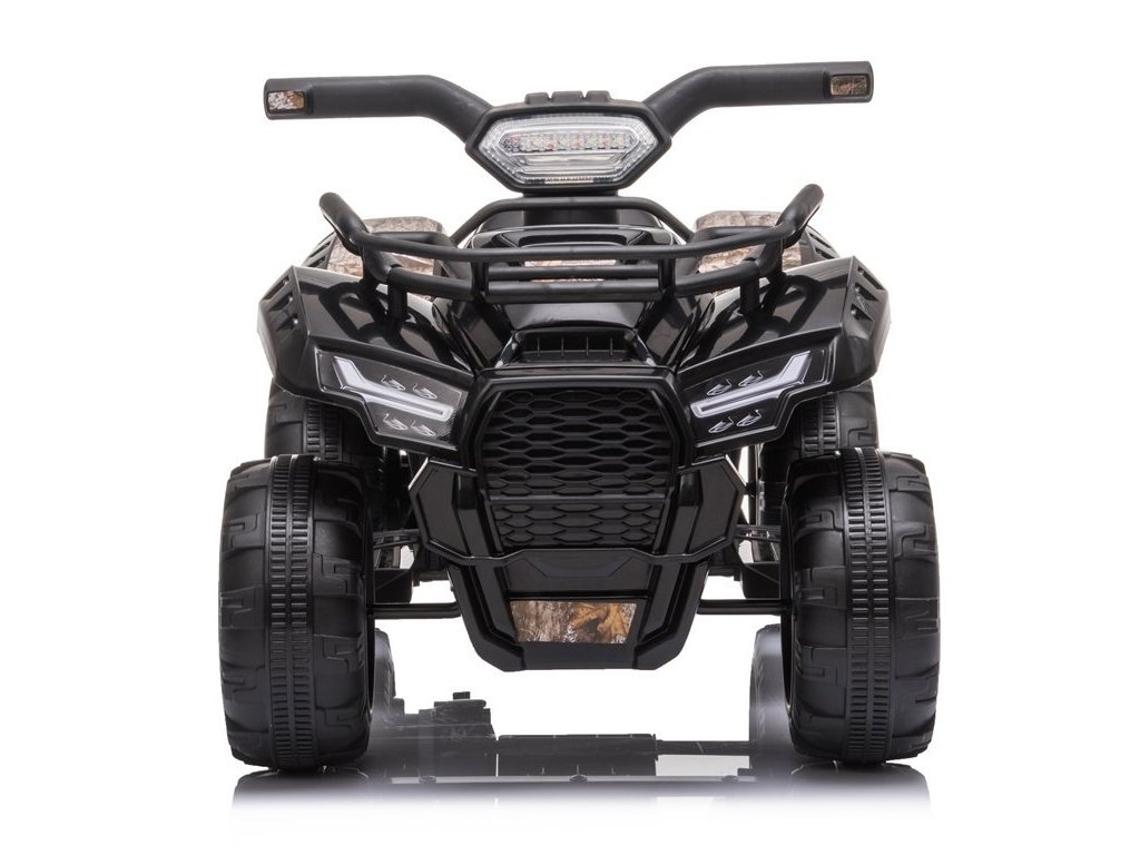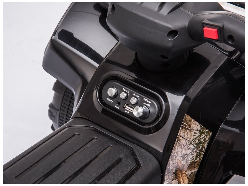 Elektrická čtyřkolka je vybavena pohodlně tvarovaným sedadlem, koly s gumovým lemem, předními LED světly a hudebním panelem se vstupy MP3 a USB.