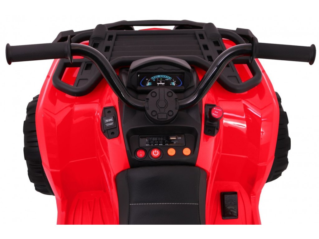 Čtyřkolka vás zaujme svým vybavením jako jsou přední LED světla a hudební panel, který má vstup pro MP3, SD kartu, AUX a USB, FM rádio, Bluetooth a tlačítka s předehranými melodiemi a klaksonem. Čtyřkolka má přední a zadní tlumiče nárazu. Při startování uslyšíte zvuky motoru.
