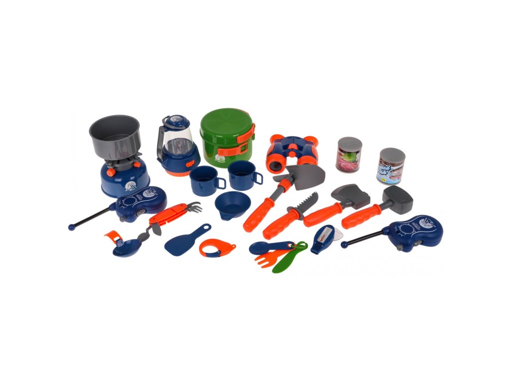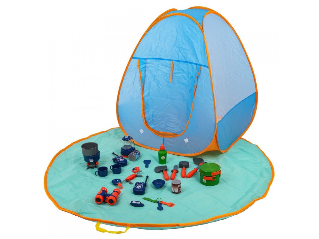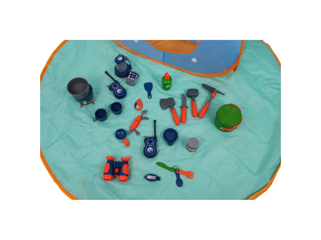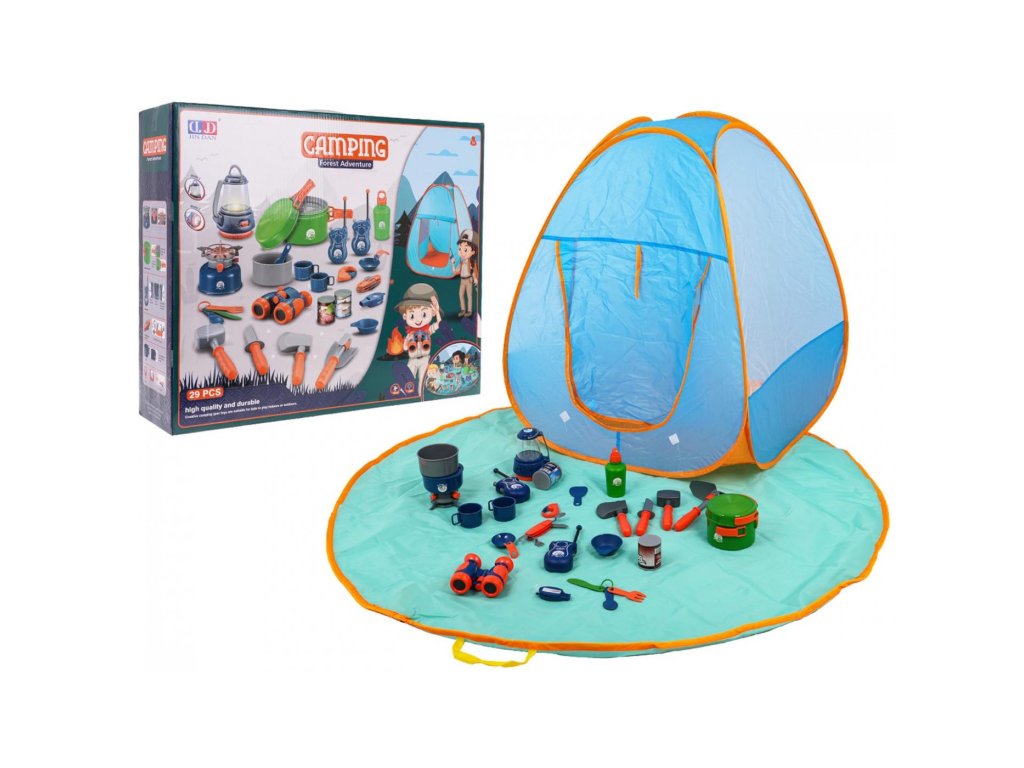 Dobře vybavená kempingová sada, stan a kempingové příslušenství pro děti od 3 let. Ideální sada pro hru v interiéru i exteriéru. Kompletní sada obsahuje 29 položek včetně stanu, kempingové podložky, turistického vařiče, baterky, kempingové lampy, dalekohledu, vysílačky a nářadí a hrnců. Sada je vyrobena z nejkvalitnějších materiálů a je pro děti zcela bezpečná.