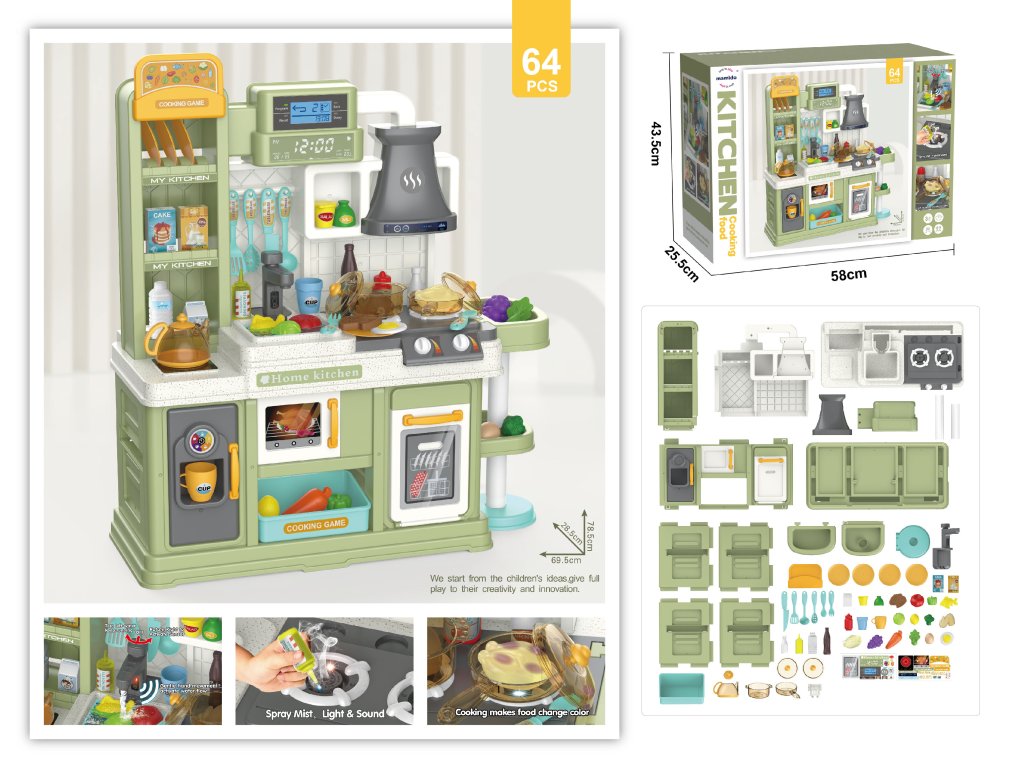Kuchyňka je vybavena tekoucí vodou s dotykovým senzorem, varnou deskou se světelnými a zvukovými efekty a kouzelným jídlem – kuřecí křidélka a stehýnka při vaření změní barvu. Celkem 64 dílů příslušenství nabízí hrnce, pánvičky, nádobí, příbory, potraviny i další doplňky pro kompletní kuchařský zážitek.
