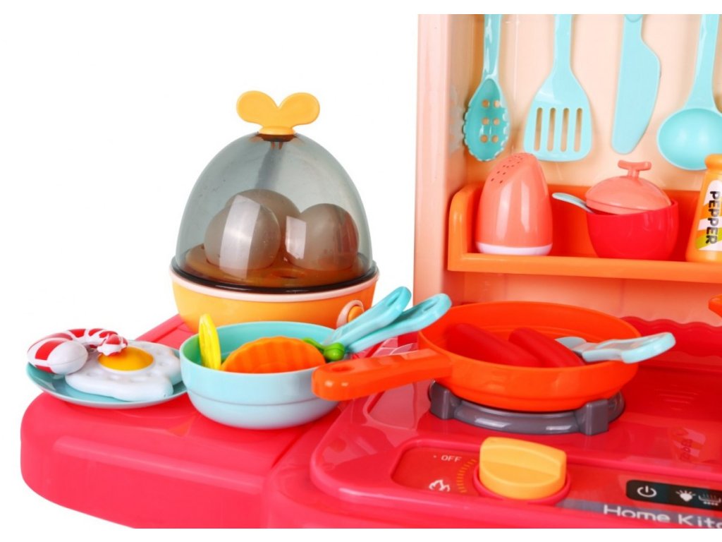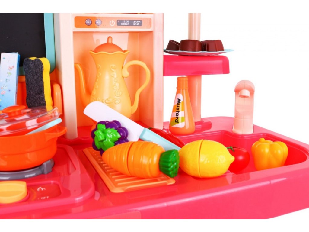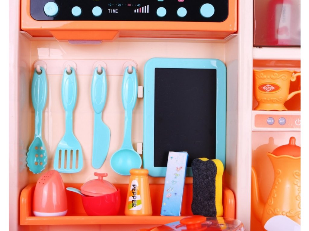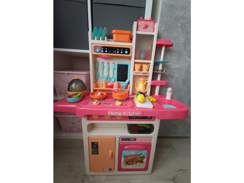 Multifunkční dětská kuchyňka s vybavením. Kuchyňka má dřez ,ke kterému lze připojit tekoucí voda, osvětlené hořáky se zvuky vaření a smažení a otočné knoflíky. Dětská kuchyňka má hudební panel a otevírací troubu a obsahuje spoustu doplňků, potravin a nádobí.