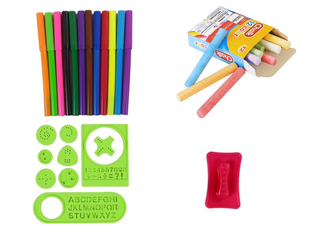 Oboustranná magnetická tabule má dvě plochy. Bílou, pro použití se smazatelnými fixy, a černou pro kreslení křídou. Sada obsahuje 12 kusů barevných fixů a také sadu 12 kusů kříd. Ve spodní části tabule jsou malá místa na veškeré příslušenství, zatímco je nepoužíváme nebo v tuto chvíli nepotřebujeme. Kromě toho je v horní části tabule nad deskou umístěn háček, který vám také umožňuje připojit list papíru. Další šablony s geometrickými obrazci a písmeny umožňují batoleti učit se číslice, písmena a nové tvary.