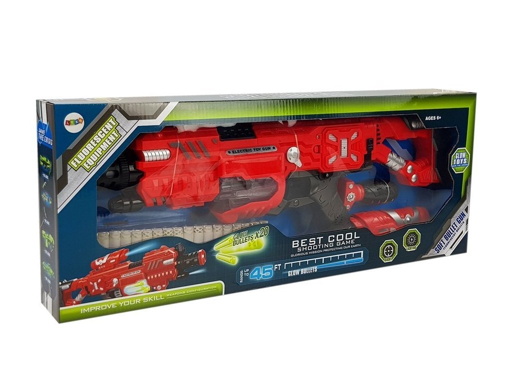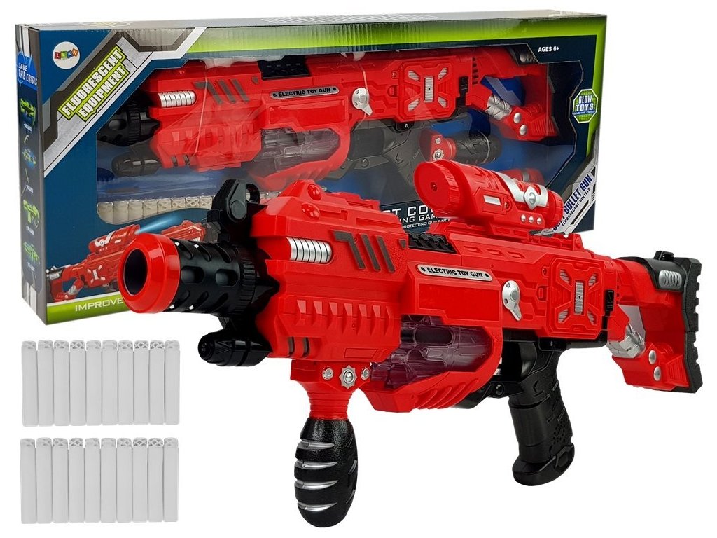 Pěnové zbraně jsou dynamickou a bezpečnou zábavou pro děti všech věkových skupin. Po zapnutí pistole se rozsvítí zásobník světlem v bílé barvě. Na horní částí pistole je umístěn laser, který ukazuju dráhu střely. S každým stisknutím spouště se spustí zvuk výstřelu a nabíjení.