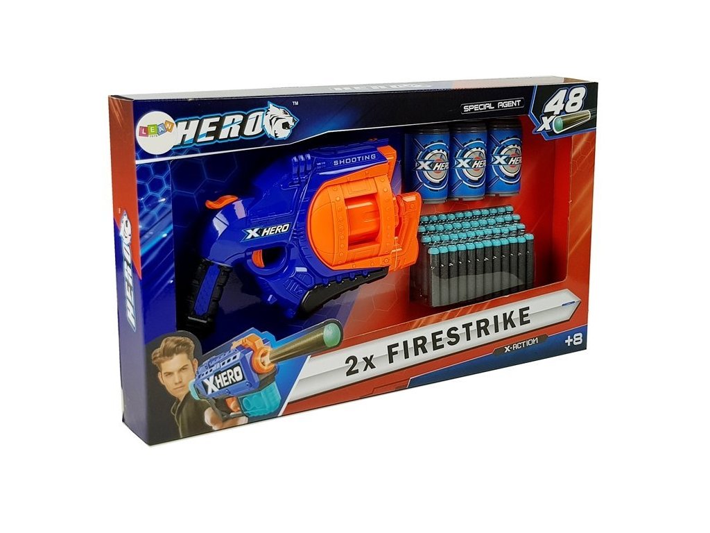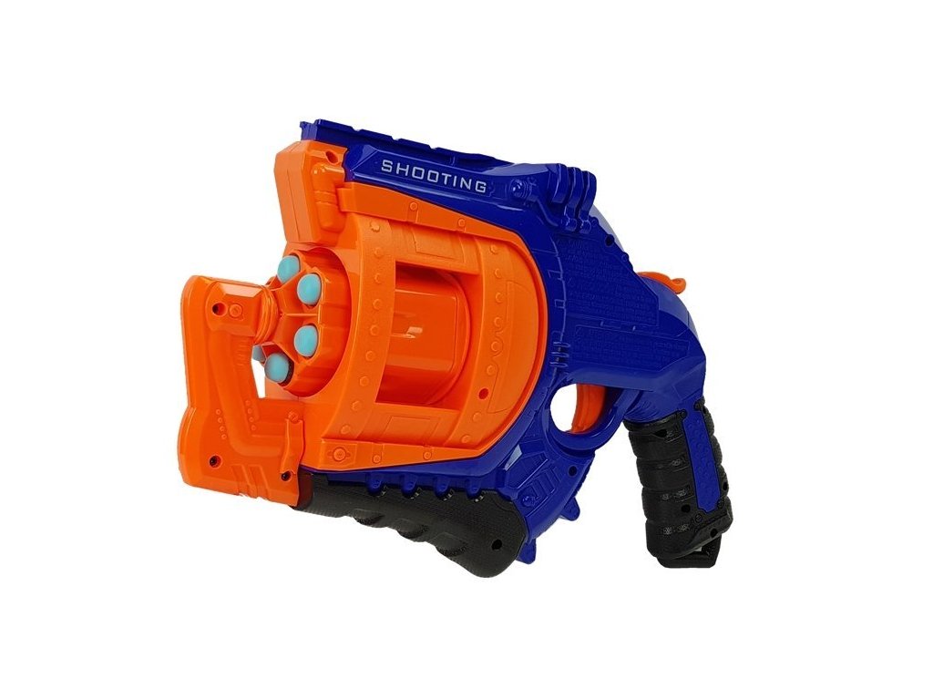 Dětská pistole má otočný zásobník pro 7 nábojů, abyste vystřelili nábojnici, musíte zatáhnout posuvník dolů a stisknout spoušť. Velké množství nábojů umožní delší zábavu. Součásti sady jsou 3 plechovky, které se mohou stát vaším cílem.