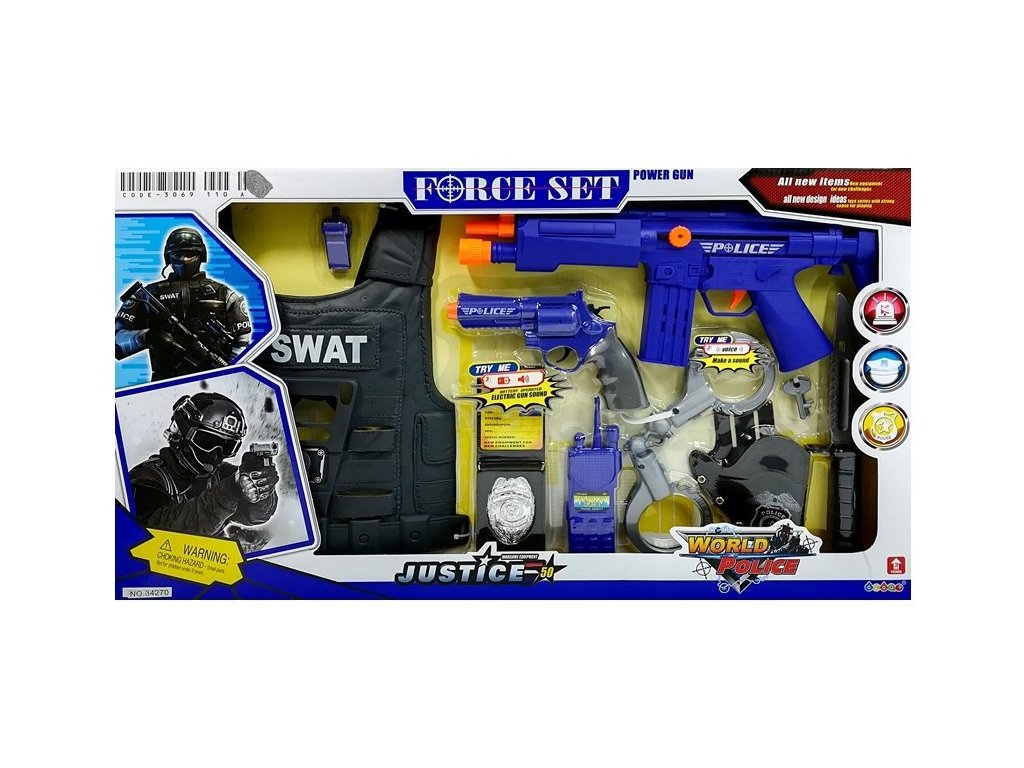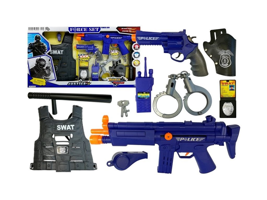 Největší výhodou policejní sady je její velikost - nemá jednu, ale dvě hračky, které jsou replikami střelných zbraní. Díky doplňkům sady si dítě může obléknout neprůstřelnou vestu, vybavit se vysílačkou, pouty, odznakem a vyzbrojit se 14 cm dlouhým gumovým nožem. Puška M4 i revolver .357 jsou vybaveny bateriemi a funkcemi, díky nimž je střelba skutečná. Puška má speciální funkci, která simuluje střelbu - po vystřelení série nábojů musí být zbraň znovu nabitá. Revolver má baterie, díky nimž při stisknutí spouště uslyšíte zvuk výstřelu.