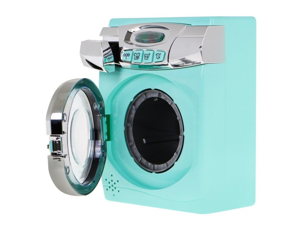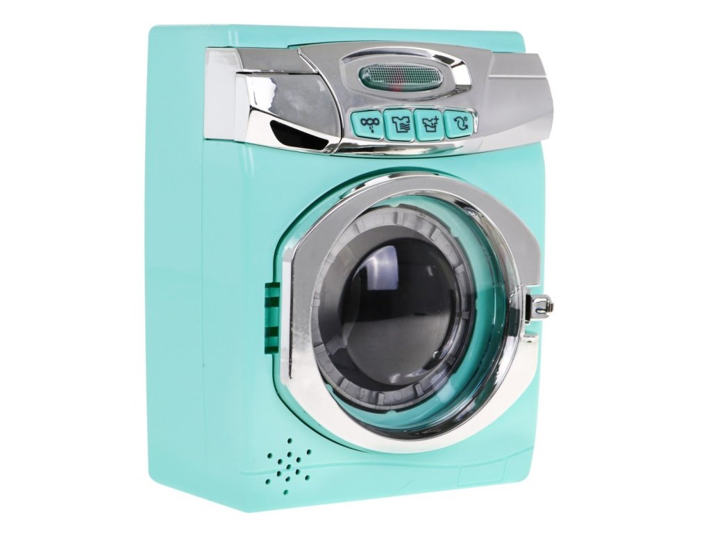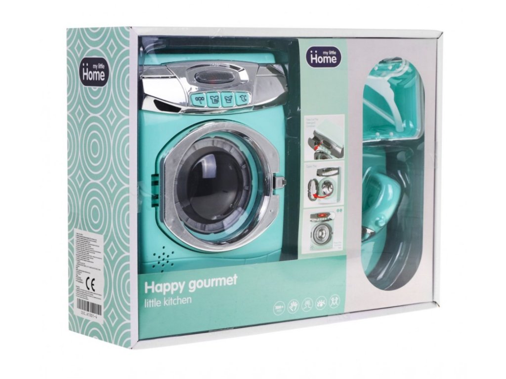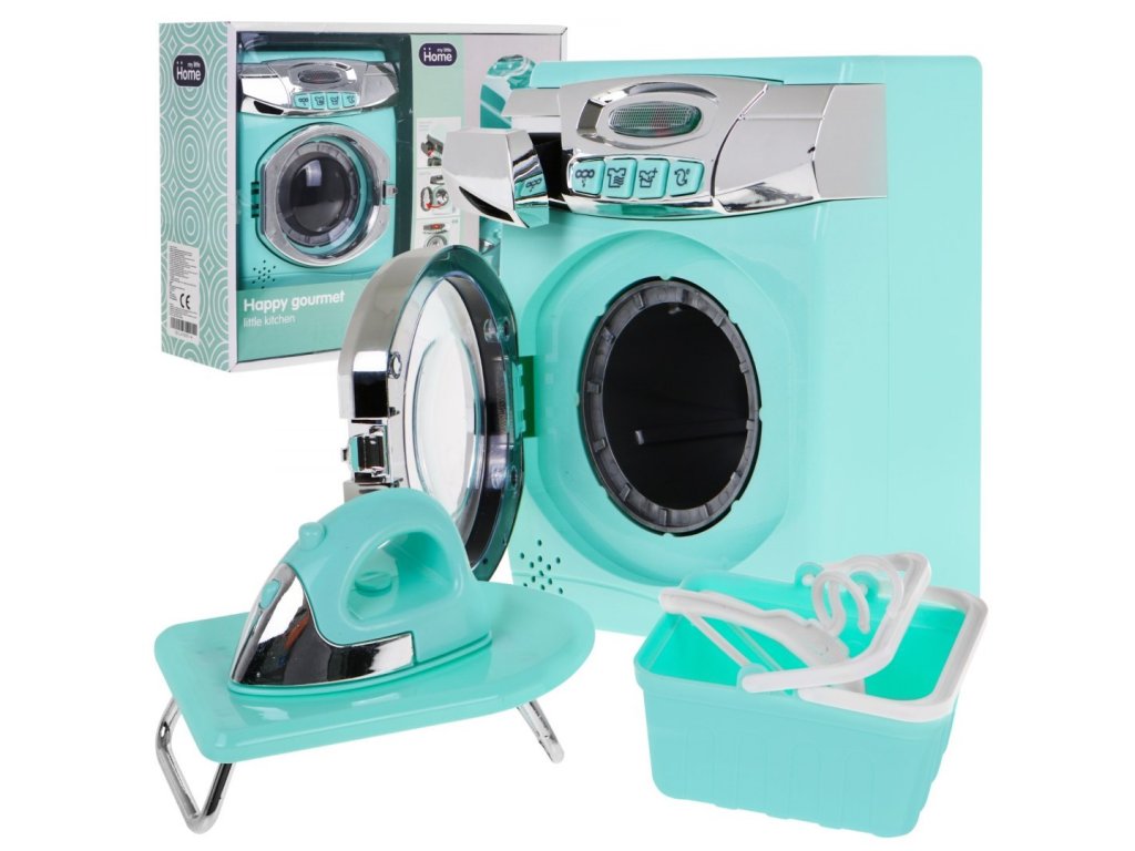 Sada dětských spotřebičů - pračky, žehlícího prkna a koše na prádlo je pro všechny děti, které rády napodobují své rodiče při každodenních domácích pracích. Pračka je napájena bateriemi AA 3x 1,5V (nejsou součástí balení). Má zvukové a svítící efekty. Pomocí tlačítek vyberete program a uslyšíte různé zvuky a kontrolka LED, na přední straně pračky, se rozsvítí.