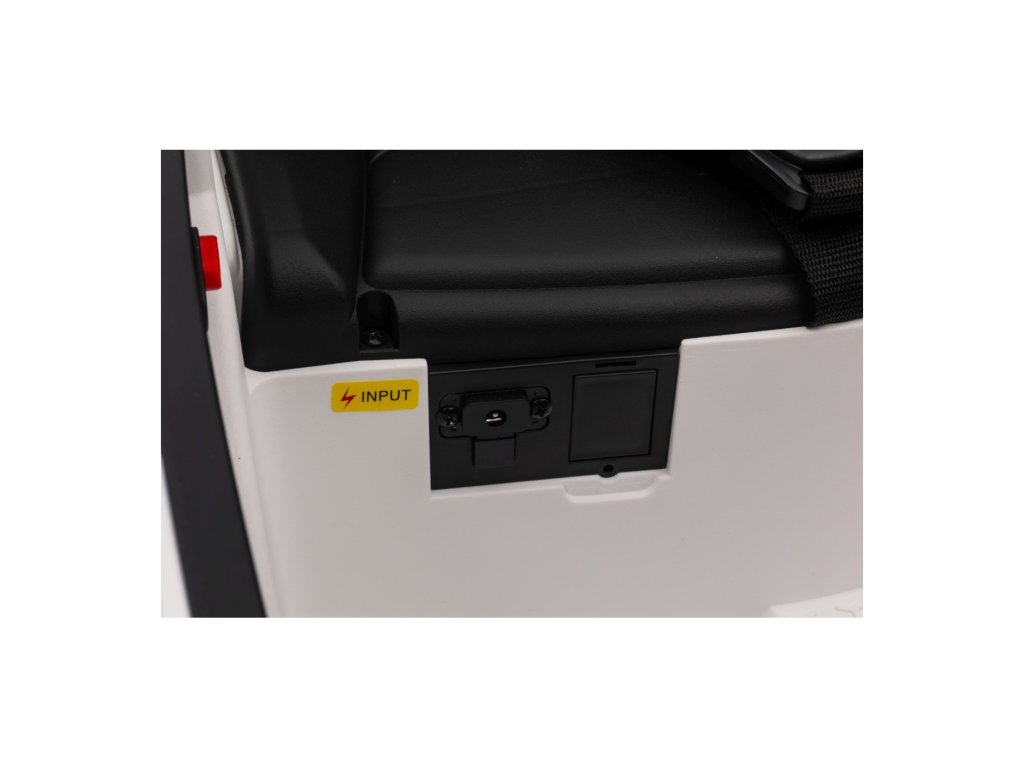 Černá sedačka je vyrobená z měkké ekologické kůže, což výrazně zvyšuje komfort jízdy, zatímco otočný volant je svou velikostí a hmotností přizpůsoben rukám několikaletých dětí, aby zajistil snadné manévrování a vyhýbání se překážkám. Na palubní desce je hudební panel s USB portem, AUX portem a bluetoothem. Použití elektrického autíčka je velmi intuitivní a jednoduché - vše, co musíte udělat, je zapnout tlačítko, poté sešlápnout plynový pedál a jet opatrně. Můžete také použít druhé řešení - sada obsahuje spolehlivé dálkové ovládání 2,4 GHz, které vám umožní ovládat auto.