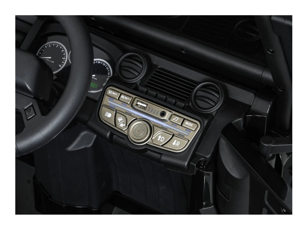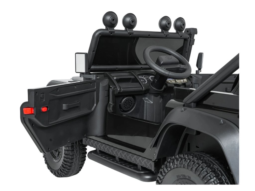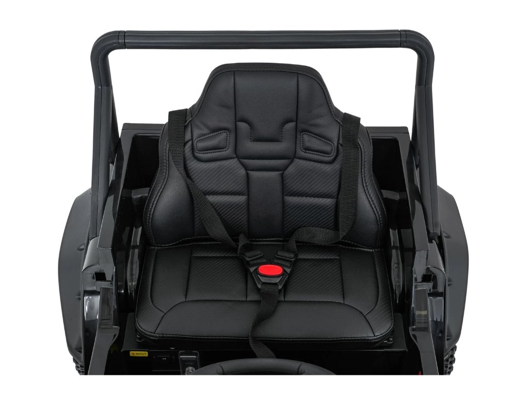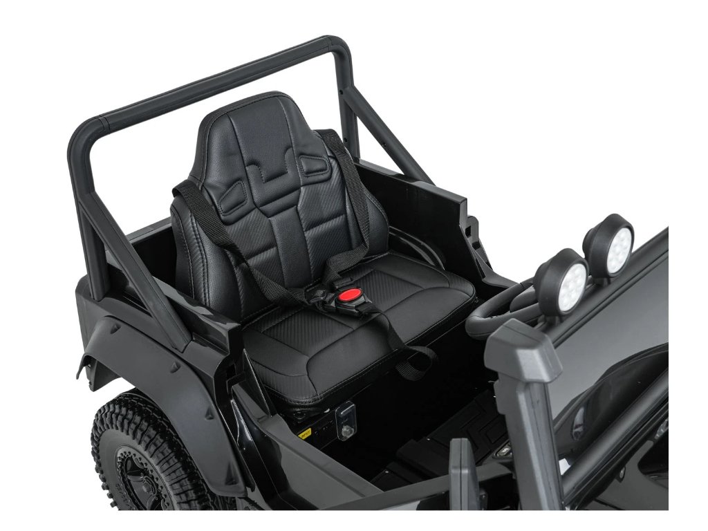 Jednomístné sedadlo z ekokůže s tříbodovým bezpečnostním pásem zajišťuje bezpečí, zatímco LED osvětlení, otevírací dveře a zvukové efekty přispívají k realistickému zážitku z jízdy. Hudební panel s MP3, Bluetooth, AUX a USB vstupem umožní přehrávat oblíbenou hudbu.