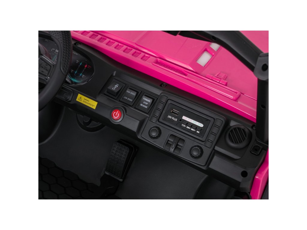 Nechybí ani hudební panel s připojením MP3, USB, AUX a Bluetooth. Díky dálkovému ovladači s bezpečnostním tlačítkem STOP mají rodiče nad jízdou plnou kontrolu.