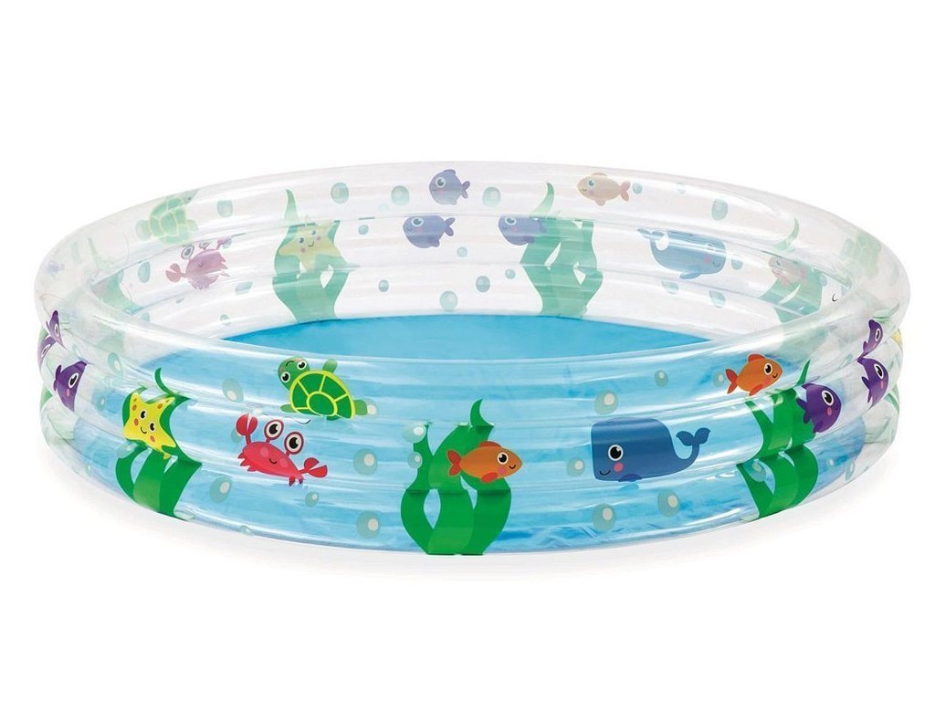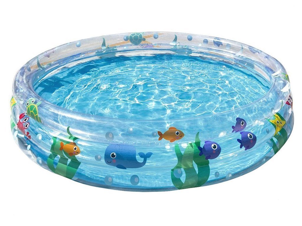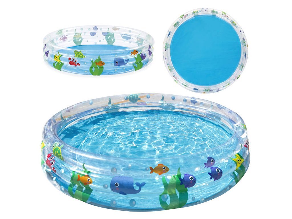 Barevný nafukovací bazén Bestway o průměru 152 cm s mořskou grafikou. Bazén se skládá ze 3 nafukovacích kruhů, které zajišťují stabilitu. Bazén je vyroben z odolného vinylu o tloušťce 0,19 mm a je ideální pro horké letní dny.