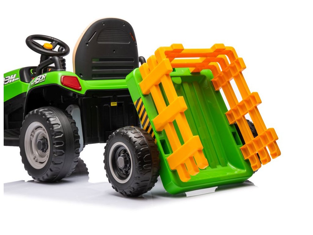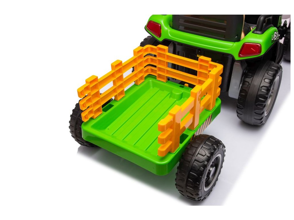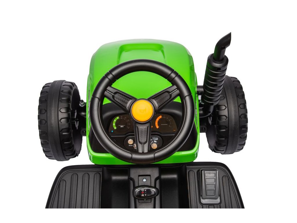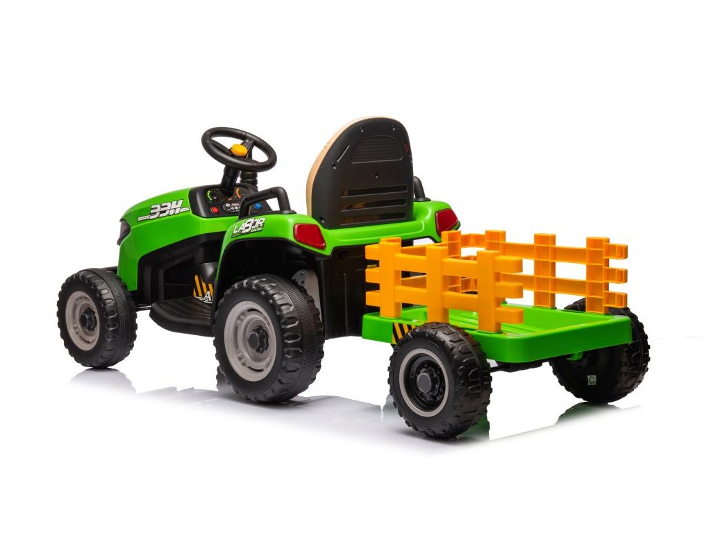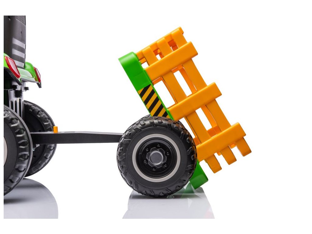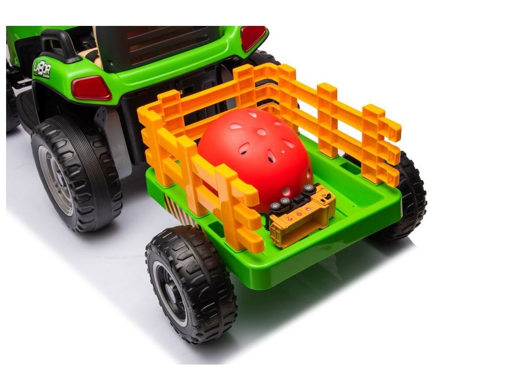 Dětský elektrický traktor s přívěsem má dva velmi výkonné motory 45W a baterii s kapacitou 12V 7Ah. Traktor má přední LED světla a hudební panel se vstupem Bluetooth. Maximální nosnost traktoru je 30 kg.