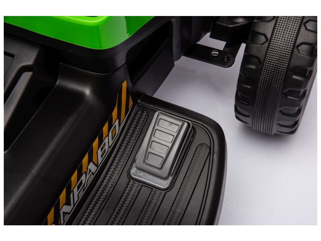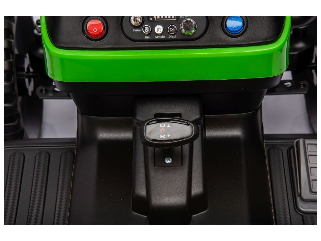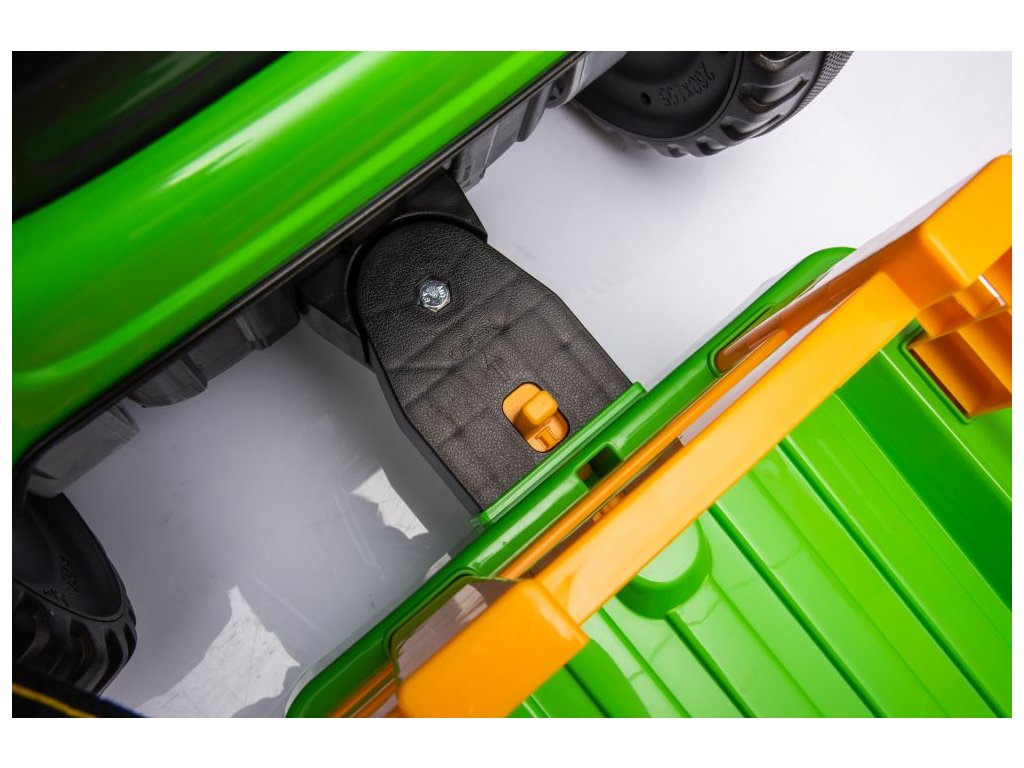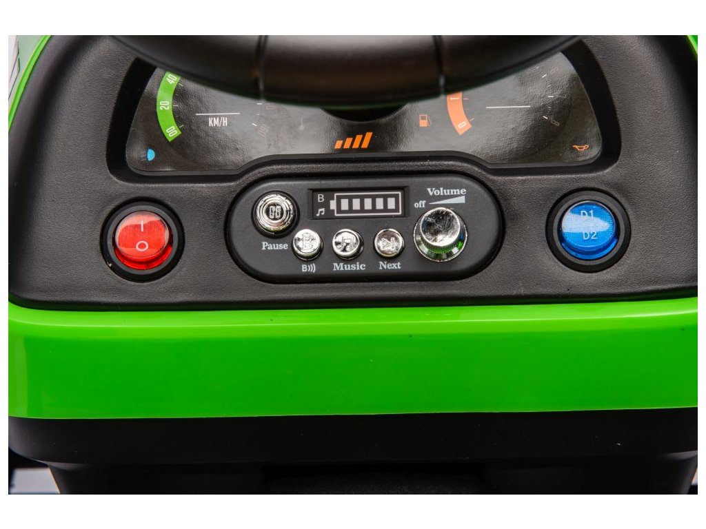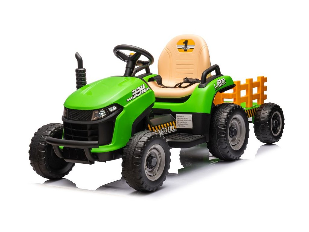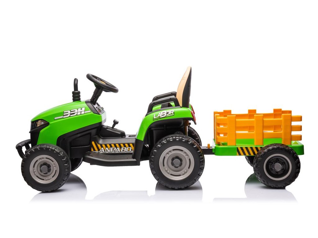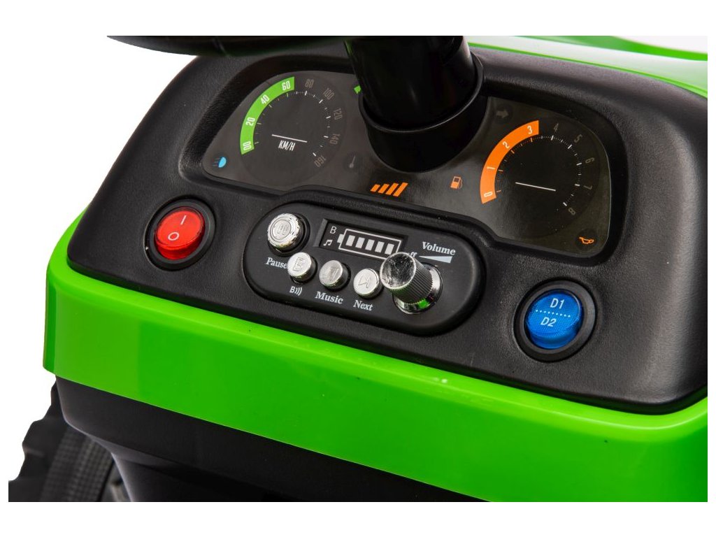 Dětský elektrický traktor s přívěsem má dva velmi výkonné motory 45W a baterii s kapacitou 12V 7Ah. Traktor má přední LED světla a hudební panel se vstupem Bluetooth. Maximální nosnost traktoru je 30 kg.