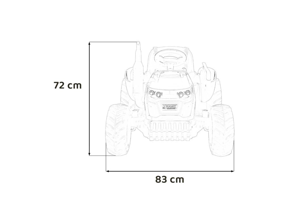 Traktor má pěnová EVA kola a plastové sedadlo. Traktor je také vybaven dálkovým ovládáním 2,4 GHz, pomocí něhož můžete řídit směr a bezpečnost jízdy Vašeho dítěte. Na dálkovým ovladači se nachází bezpečnostní tlačítko STOP, které vozítko zastaví a vypne všechny jeho funkce.