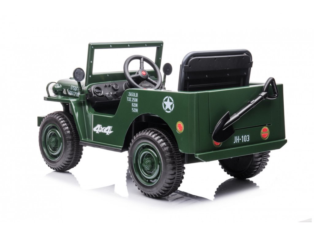 Dětské vojenské elektrické autíčko je vybaveno čtyřmi elektrickými motory o výkonu 35W a 12V 7Ah baterií. O pohodlnou jízdu se postarají pěnová EVA kola. Dítěti jízdu určitě zpříjemní hudební panel s MP3, předehranými melodiemi, možnost připojení se přes Bluetooth a vstup pro USB. Na volantu se nachází klakson.