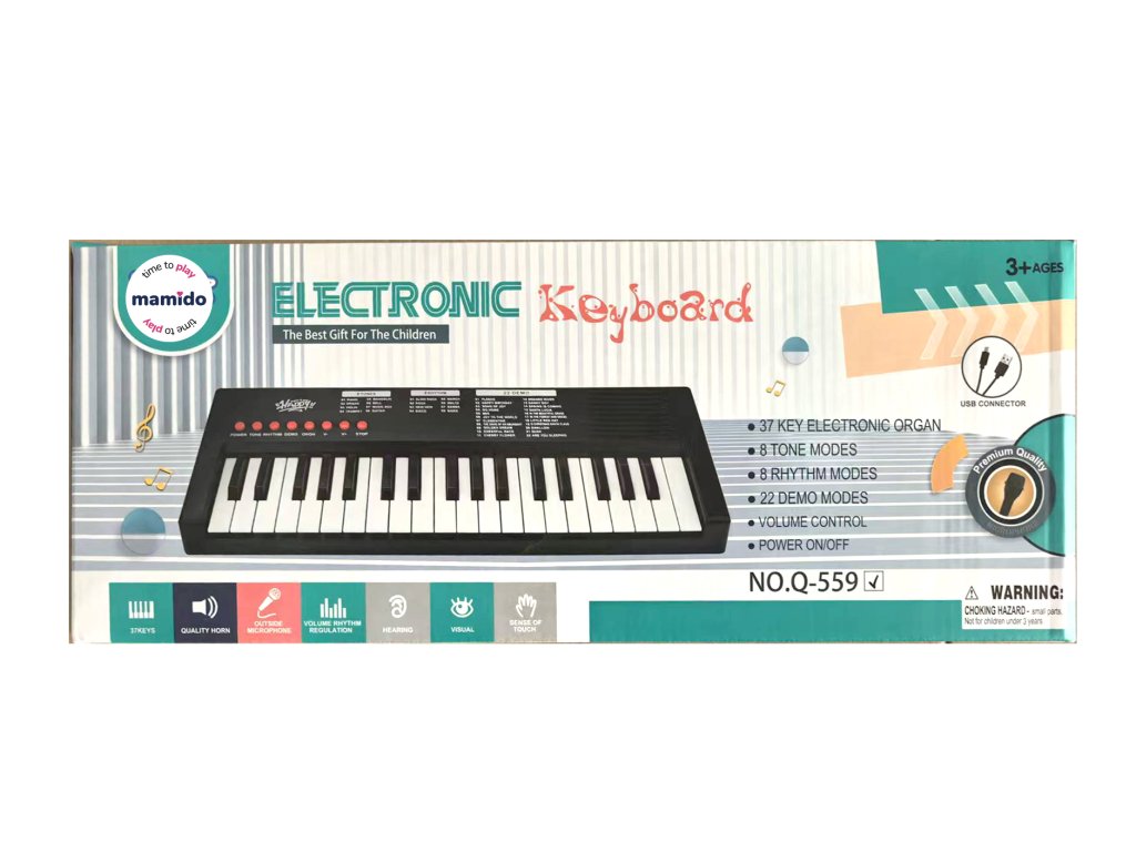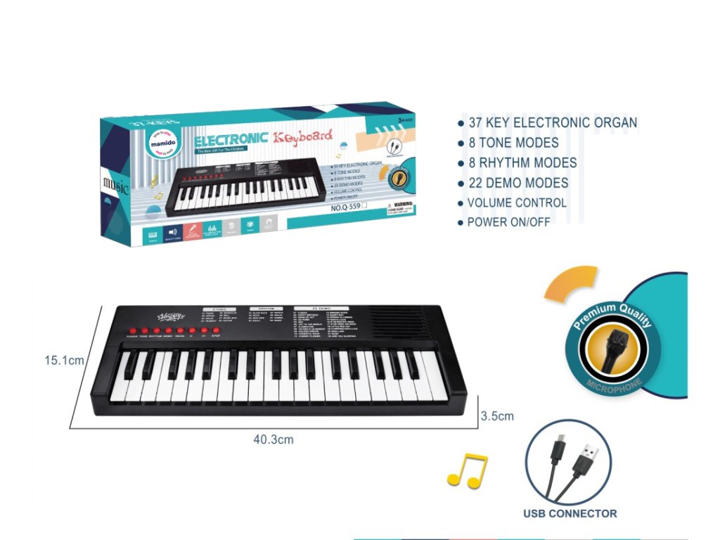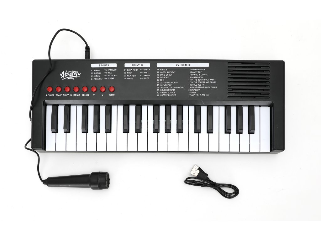 Objev svět hudby s dětským keyboardem o délce 40 cm, který je skvělou volbou pro malé začínající hudebníky. Keyboard má 37 kláves, 8 tónových režimů, 8 rytmů a 22 demo skladeb, které pomáhají rozvíjet hudební sluch i kreativitu. Ovládání je jednoduché pomocí červených tlačítek na panelu, kde si děti mohou nastavit zvuk, hlasitost, spustit doprovody nebo vyzkoušet různé hudební styly. Napájení probíhá pomocí přiloženého USB kabelu, takže odpadá nutnost dokupovat baterie.