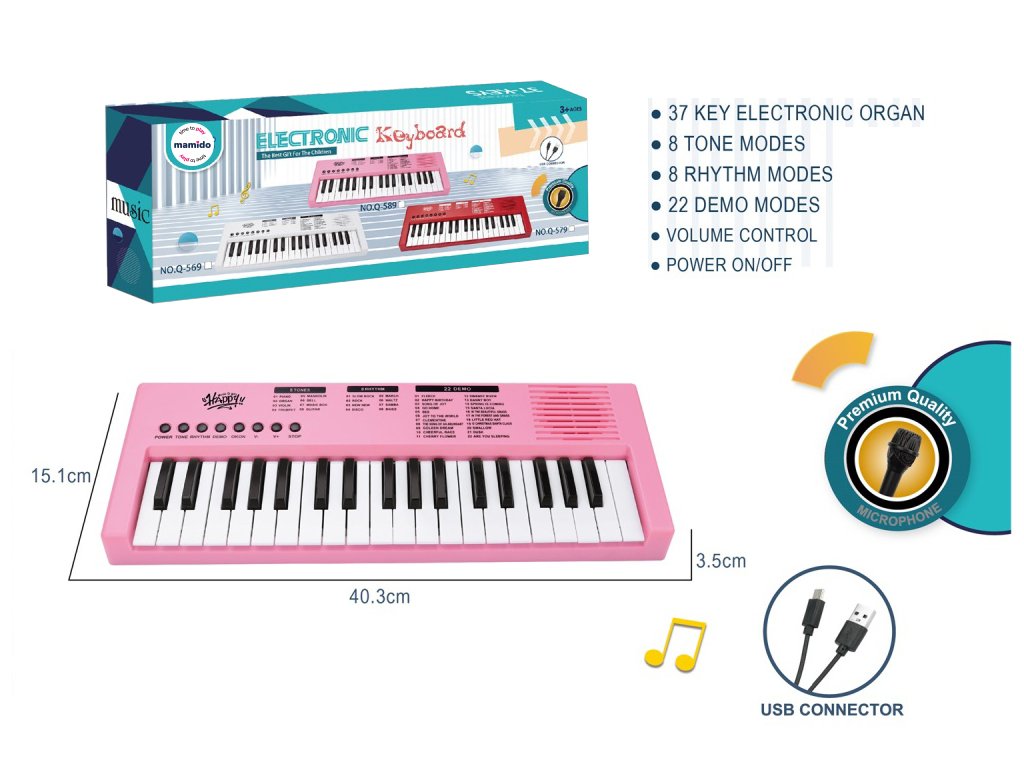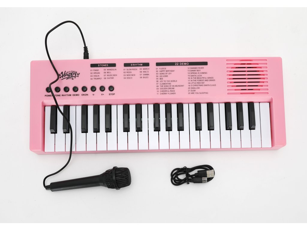Objev svět hudby s dětským keyboardem o délce 40 cm, který je skvělou volbou pro malé začínající hudebníky. Keyboard má 37 kláves, 8 tónových režimů, 8 rytmů a 22 demo skladeb, které pomáhají rozvíjet hudební sluch i kreativitu. Ovládání je jednoduché pomocí červených tlačítek na panelu, kde si děti mohou nastavit zvuk, hlasitost, spustit doprovody nebo vyzkoušet různé hudební styly. Napájení probíhá pomocí přiloženého USB kabelu, takže odpadá nutnost dokupovat baterie.