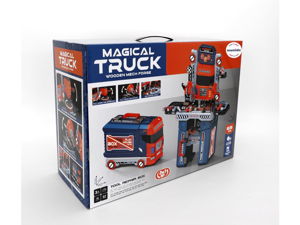 Velký nákladní vůz 2v1, který se během chvilky promění v dílnu s pracovním stolem a nářadím. Skvělá hračka pro malé kutily, kteří rádi šroubují, opravují a zkoumají, jak věci fungují. Všechny díly se dají uložit přímo do kamionu, který slouží jako praktický kufřík na kolečkách s madlem pro snadné přenášení.