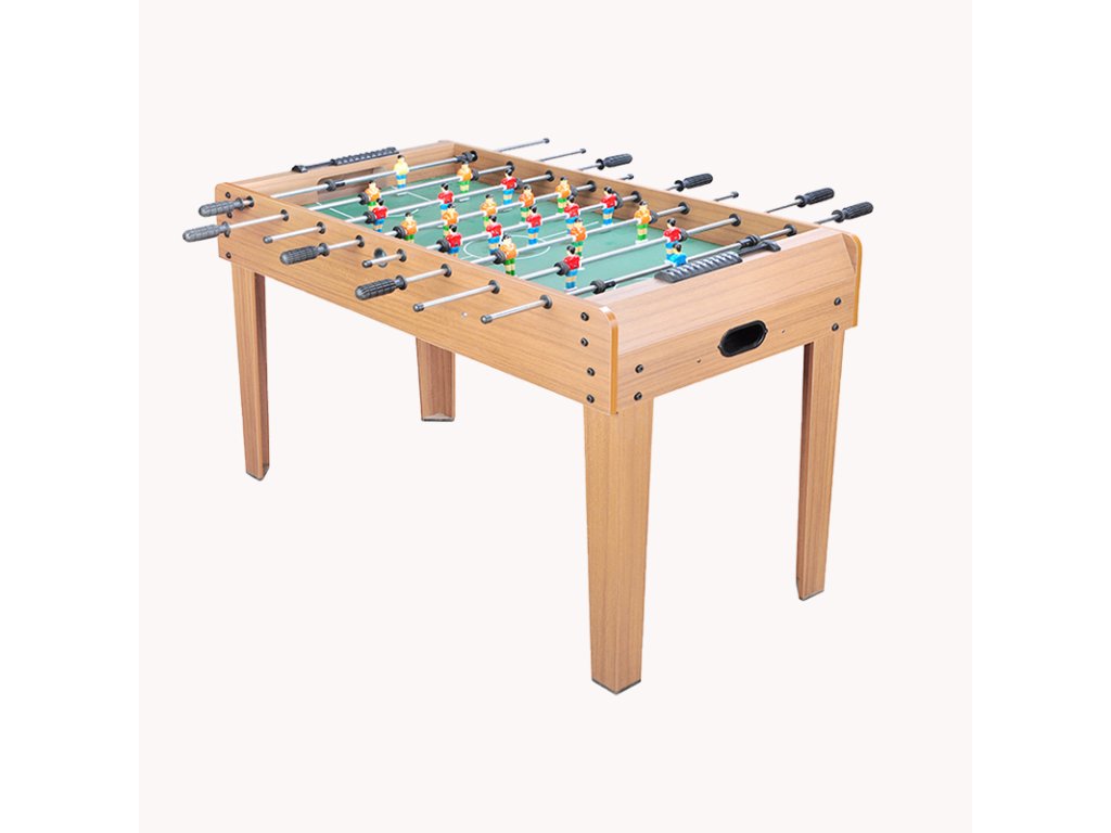 Fotbálek je vyrobený v příjemném dřevěném vzhledu, který působí moderně a hodí se do každého interiéru. Herní plocha imituje fotbalové hřiště a zajišťuje jasnou přehlednost během hry. Otočné kovové tyče s pohodlnými madly umožňují přesné manévrování hráčů a rychlé akce. Boční otvory slouží pro jednoduché vhazování míčku a manuální počítadla gólů u každé branky udržují přehled o skóre.