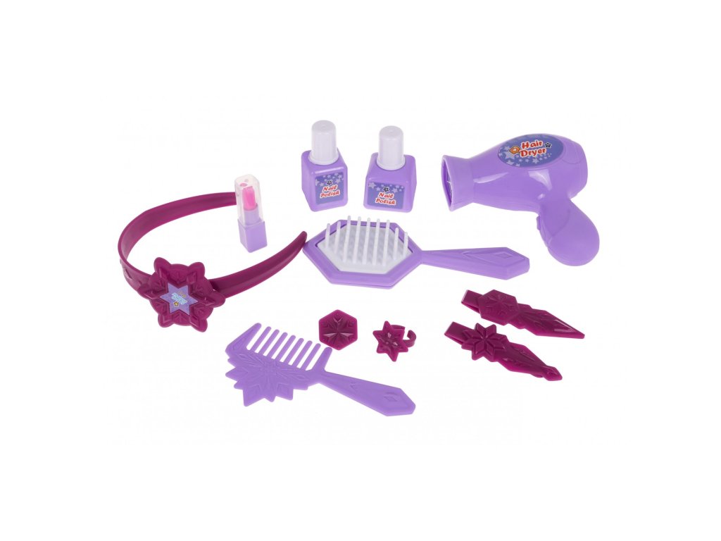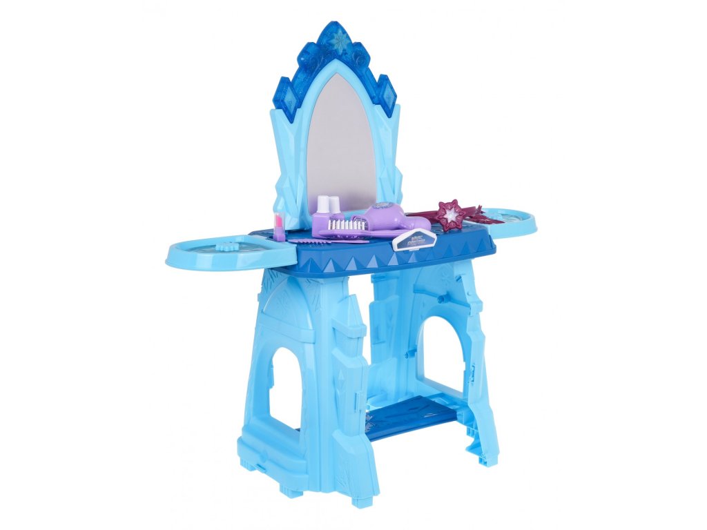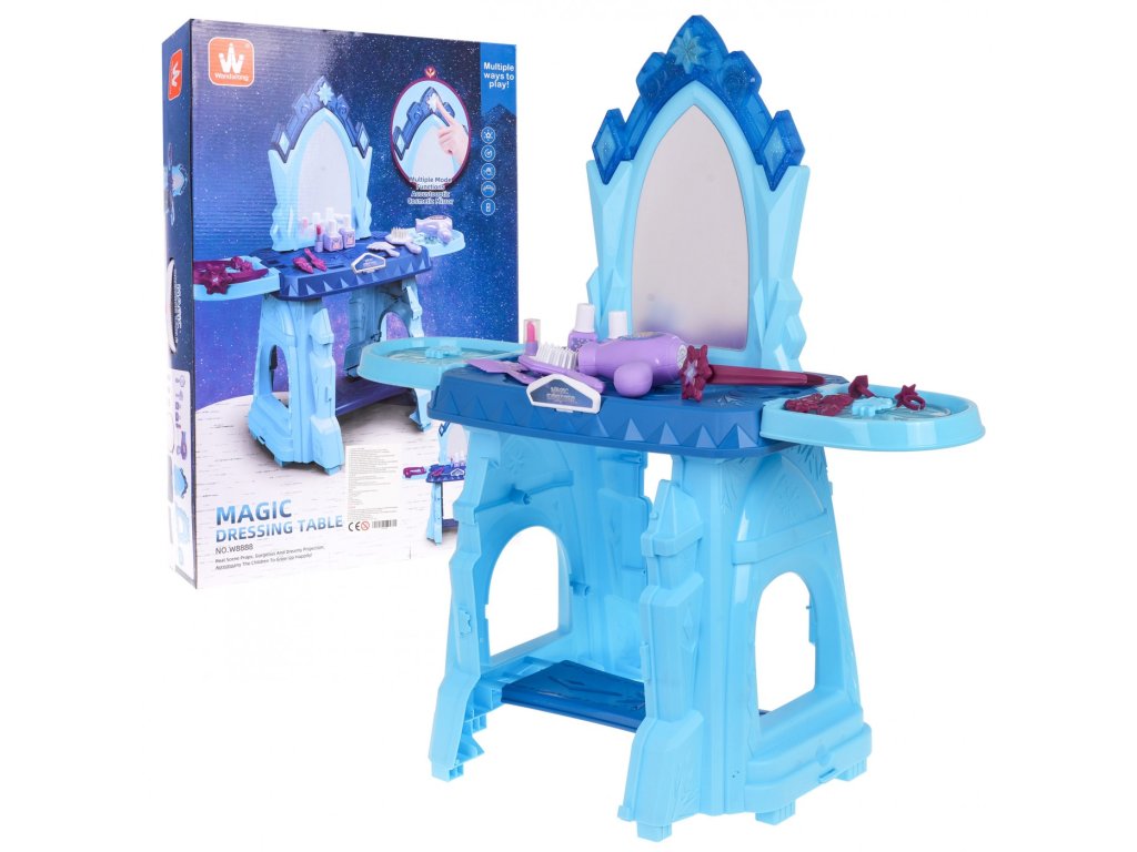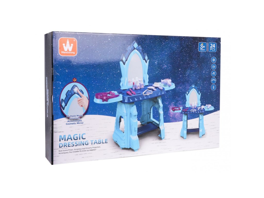 Interaktivní toaletní stolek se zvukovou a světelnou funkcí je vhodný pro děti od 3 let. Sada obsahuje toaletní stolek a atrapy kosmetiky a šperků. Toaletní stolek má velké zrcadlo a nad ním je tlačítko ve tvaru hvězdy, které po stisknutí aktivuje zvukové a světelné efekty. Poličky po stranách lze také otevřít jako okenice. Toaletní stolek je napájen 2 bateriemi AAA 1,5 V (nejsou součástí balení).
