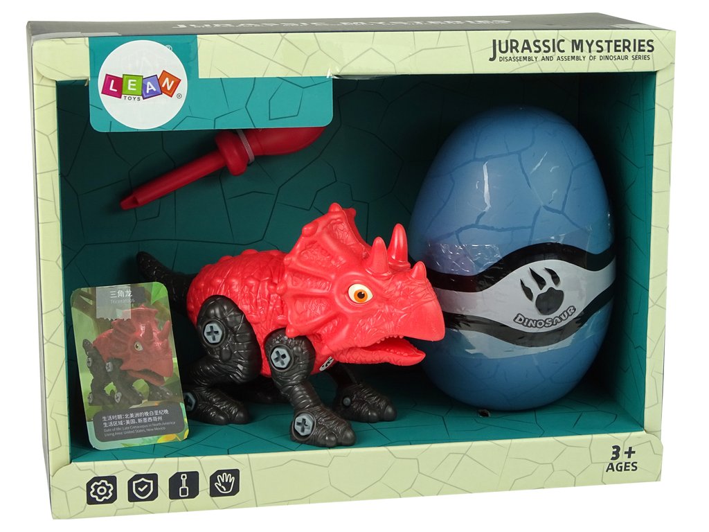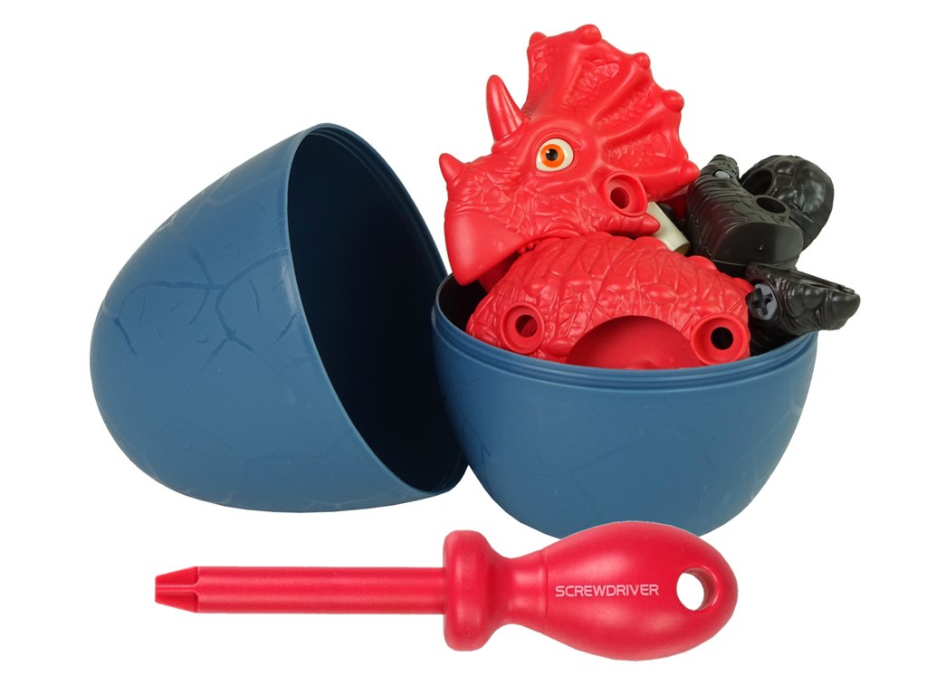 Triceratops Dinosaur lze rozebrat pomocí šroubováku. Po odšroubování můžete celek schovat do vajíčka. Všechny prvky jsou pohyblivé, což usnadňuje hru.