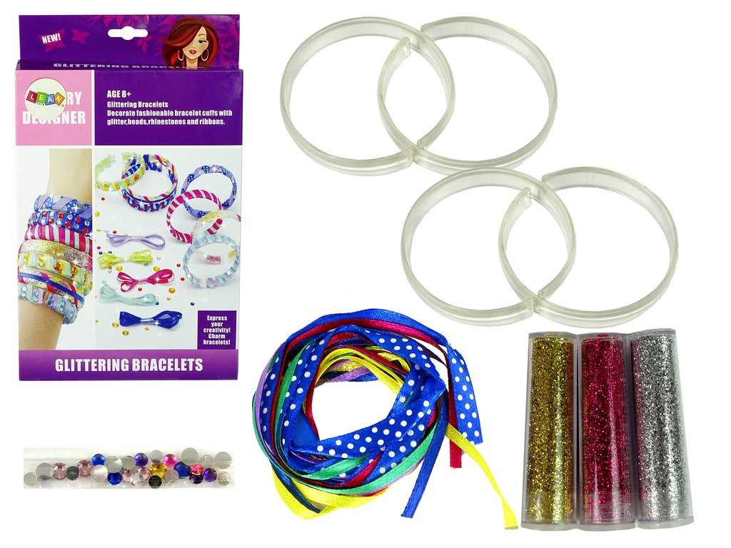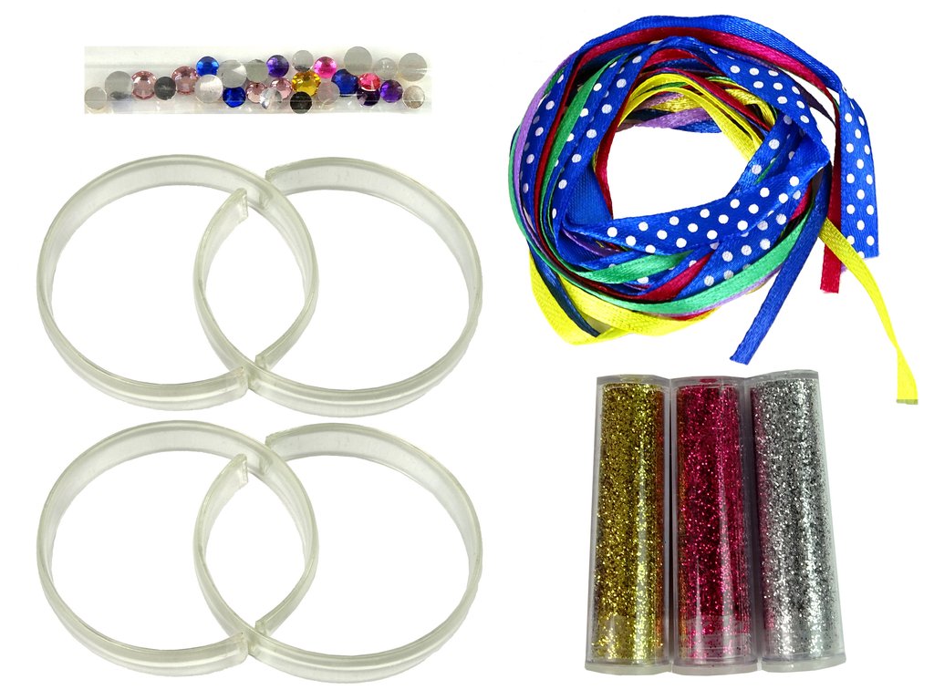 Nalepte oboustrannou lepicí pásku na speciální průhledný náramek, vyberte si svou oblíbenou stuhu, kterou ho omotáte, přidejte doplňky a máte hotovo!