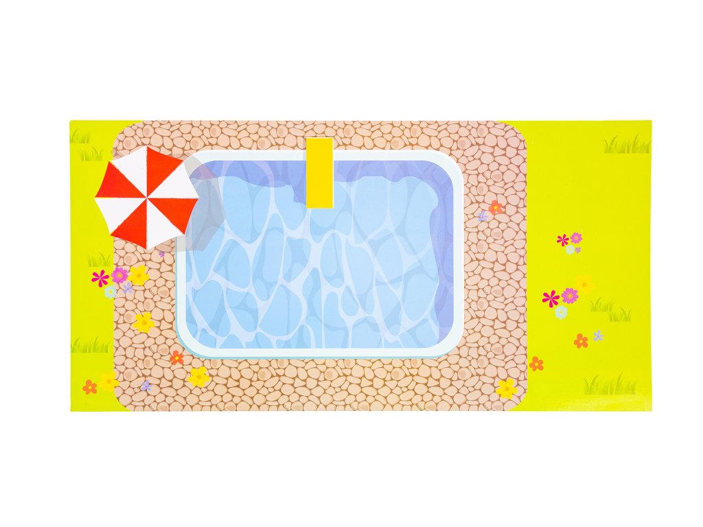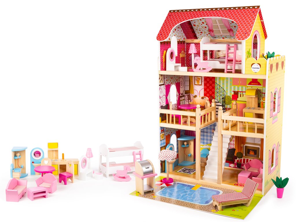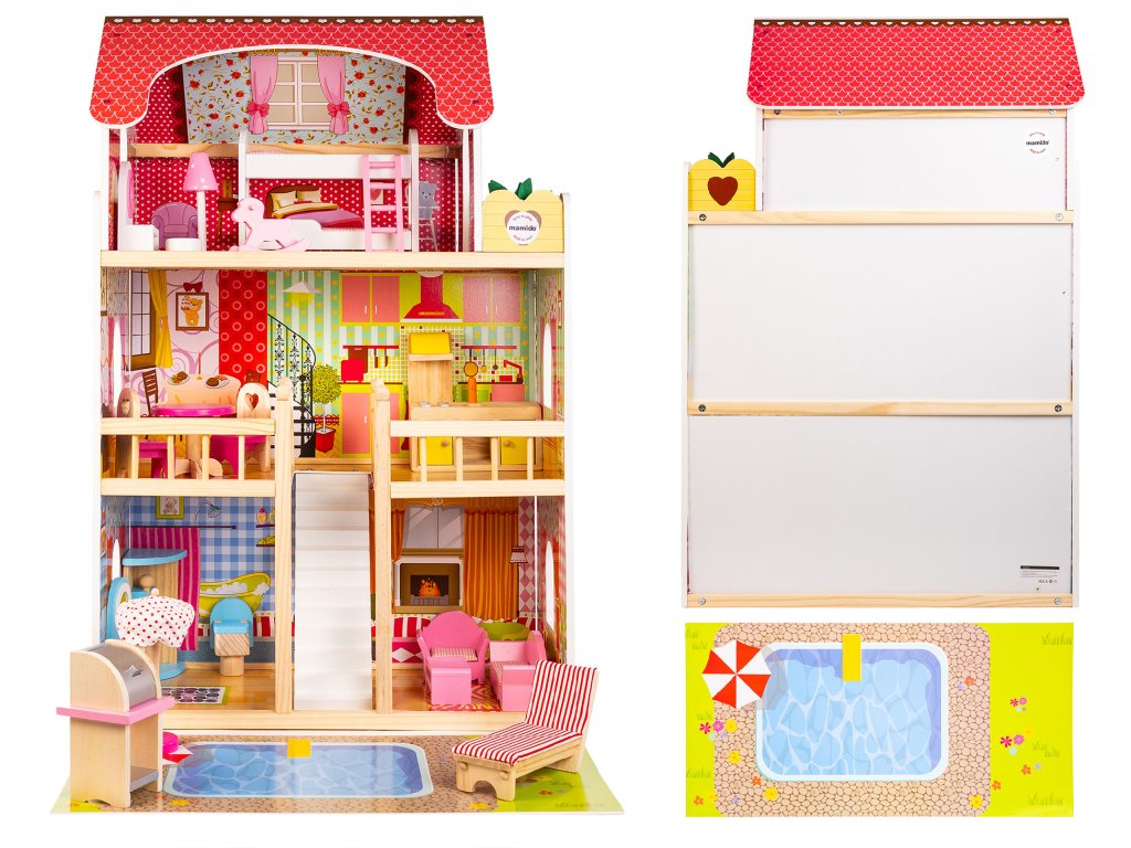 - Venkovní prostor s bazénem: Rozkládací plocha s bazénem je perfektní místo pro pořádání zahradních oslav a odpočinek panenek.