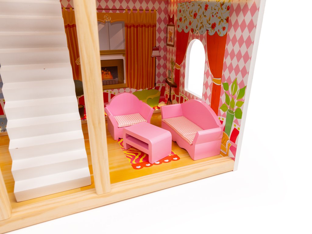 - Bezpečné materiály: Domeček je vyroben z odolného dřeva a MDF, bezpečného pro děti.
