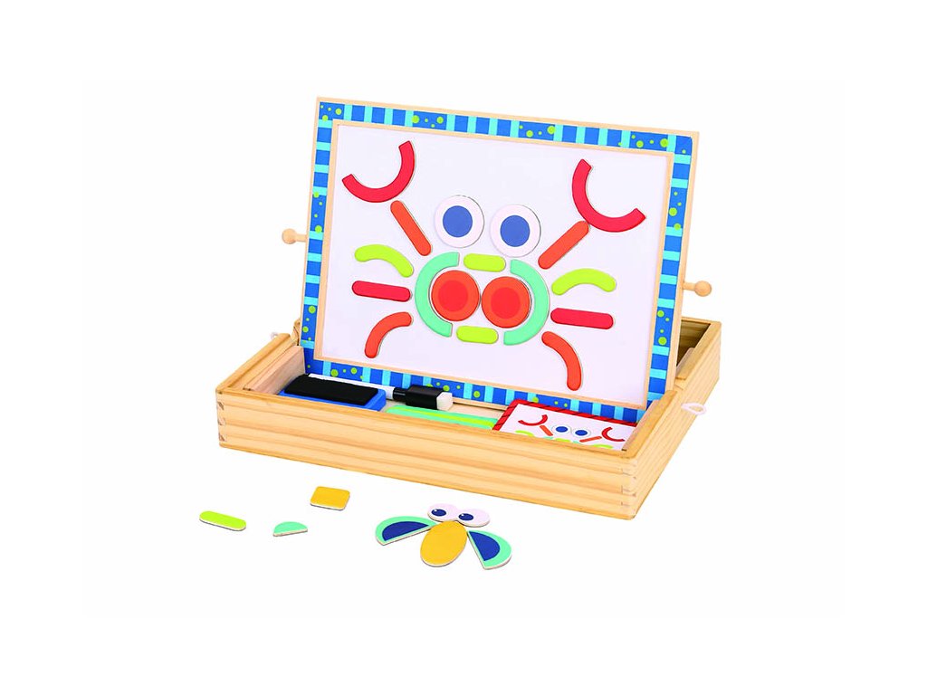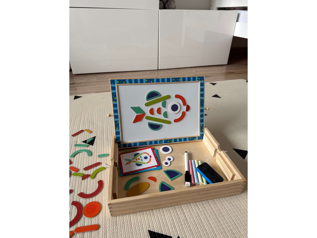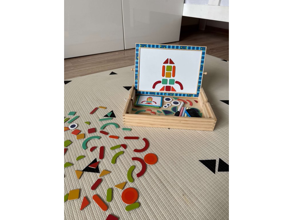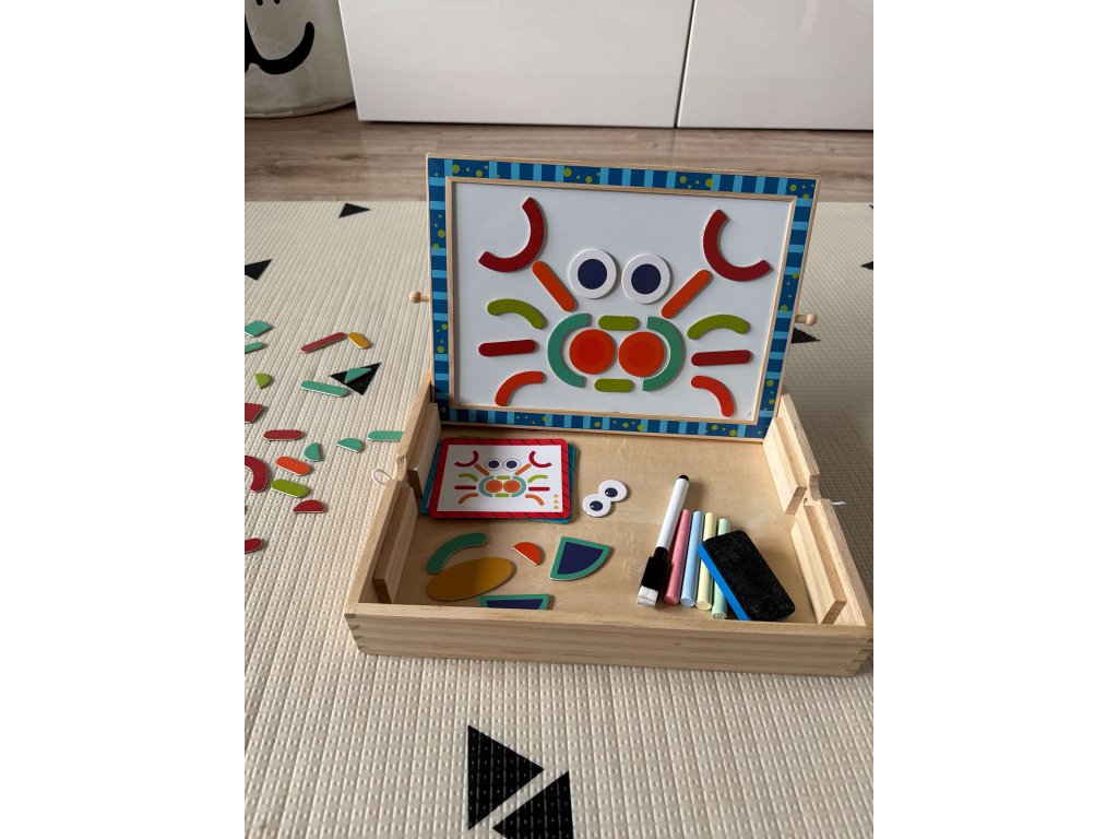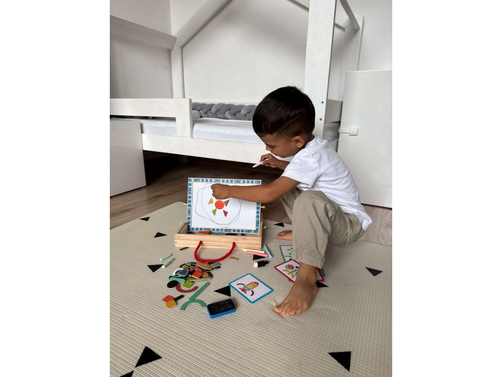 Seznamte se s Dřevěnou magnetickou tabulí s puzzle, ideální pro děti od 3 let. Tato multifunkční hračka podporuje kreativitu, jemnou motoriku a logické myšlení. Jedna strana tabule je magnetická a druhá slouží jako křídová tabule. Sada obsahuje barevné magnetické tvary, které děti mohou skládat do různých obrázků, a také křídy a mazací houbičku. Vyrobena z bezpečných a ekologických materiálů, hračka je odolná a šetrná k dětské pokožce.