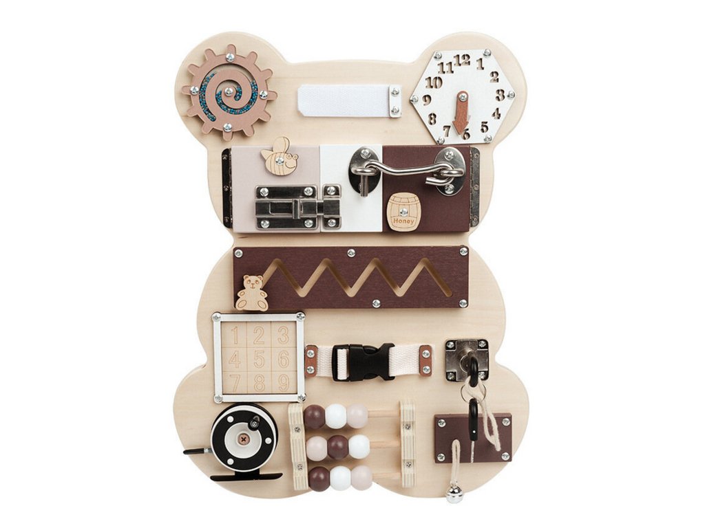 Dřevěná senzorická manipulační tabule Medvídek 14 prvků