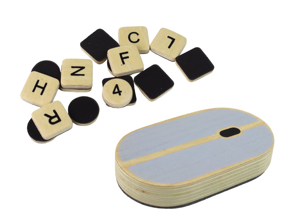 Místo tradiční klávesnice má hračka dřevěné kostky, které lze nasadit na odpovídající místa na klávesnici. Jedná se o neobvyklý přístup k učení tvorby písmen a rozvoji jemné motoriky.
