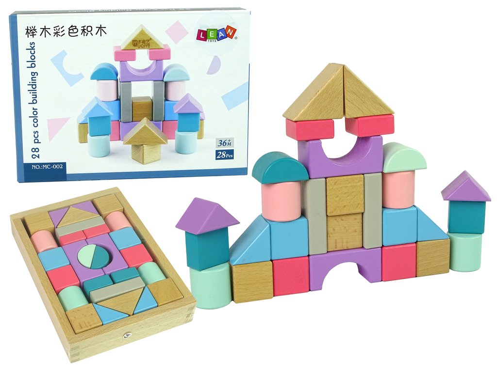 Sada se skládá z kostek různých velikostí a tvarů. Dřevěné kostky pomůžou vašemu dítěti rozvíjet prostorovou představivost, přesnost a kreativitu. Celá sada obsahuje 28 kostek.