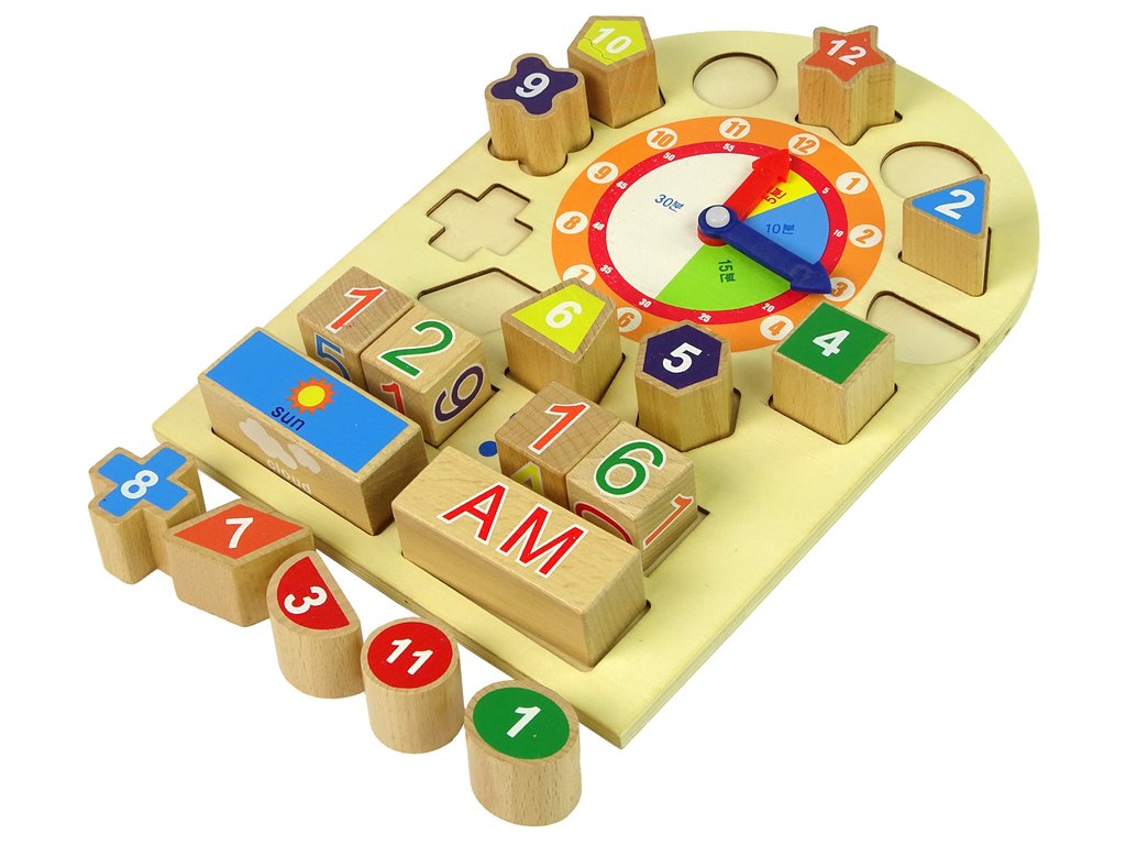 Dřevěné vzdělávací hodiny mají pohyblivé ručičky, které lze libovolně nastavit, a tím se učit nastavený čas. Kostky s čísly umožní děti okamžitě zapsat. Na dřevěných blocích se nachází obrázky s počasím a denní dobou.