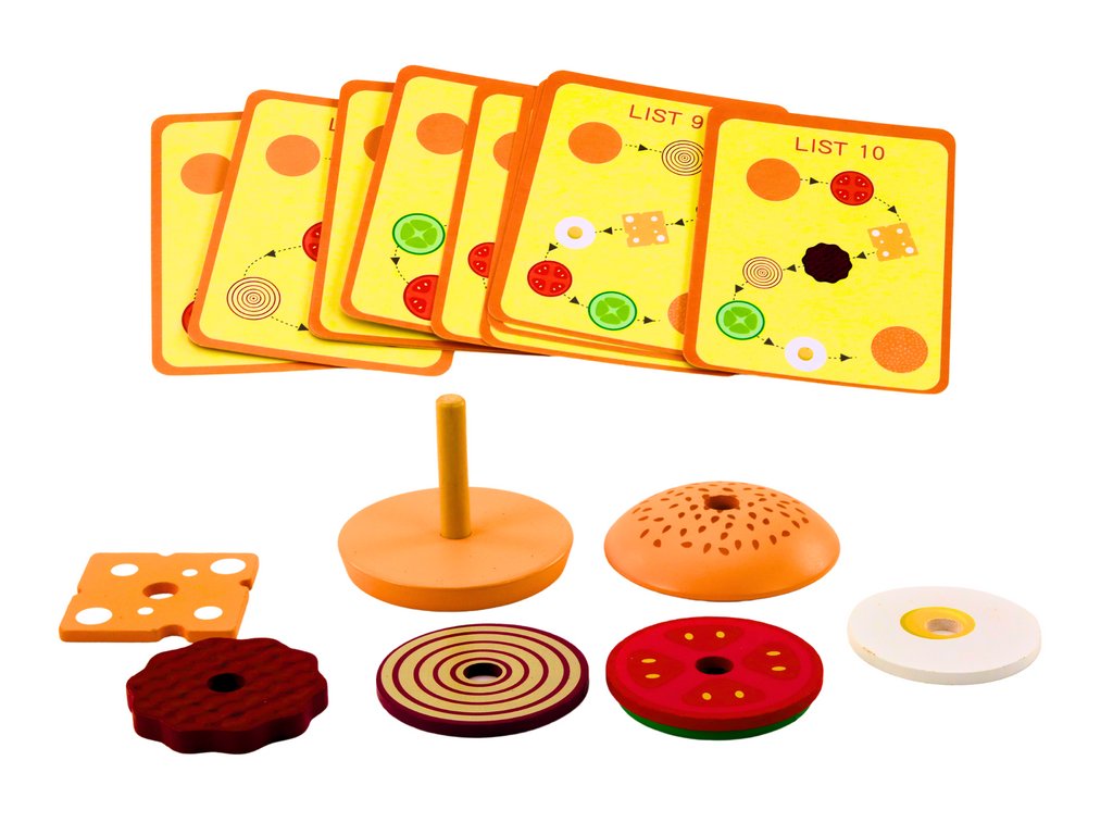 Dřevěný hamburger se skládá z 8 dílků a je skvělou vzdělávací hračkou, která dětem nabízí zábavu i kreativní rozvoj. Sada obsahuje různé ingredience, jako jsou housky, kotleta, sýr či zelenina, které lze libovolně kombinovat a tvořit vlastní hamburger. Součástí jsou také karty s 10 recepty, které děti mohou následovat a rozvíjet tak své dovednosti v plánování a přípravě jídla. Hra s touto sadou podporuje koordinaci, kreativitu a učení barev i tvarů, přičemž dřevěné prvky zajišťují dlouhou životnost a bezpečnost.