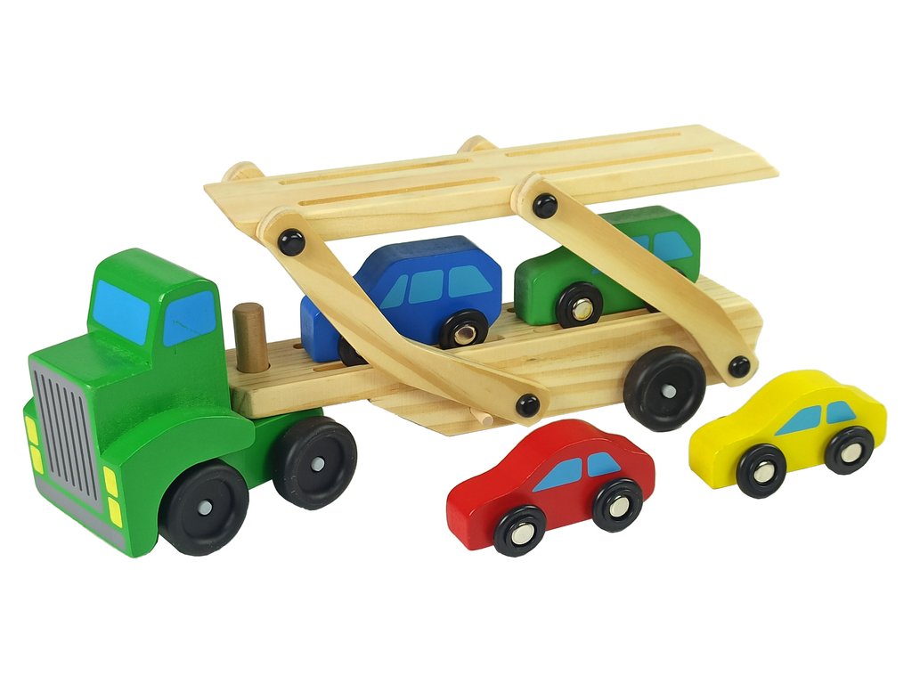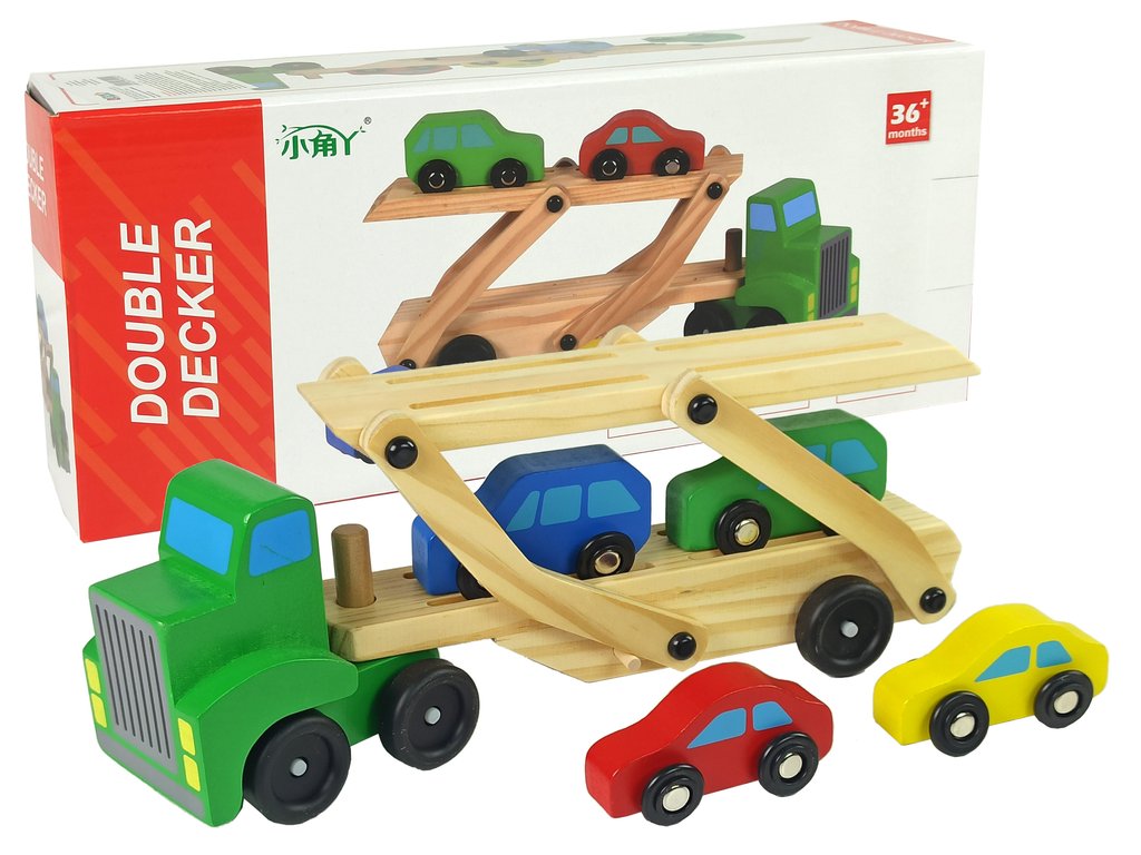 Dvoupatrový autopřepravník ze dřeva. Sada obsahuje nákladní auto, dvoupatrový odtahový vůz a 4 auta. Všechny prvky jsou vyrobeny z vysoce kvalitního dřeva a natřeny nezávadnou barvou.