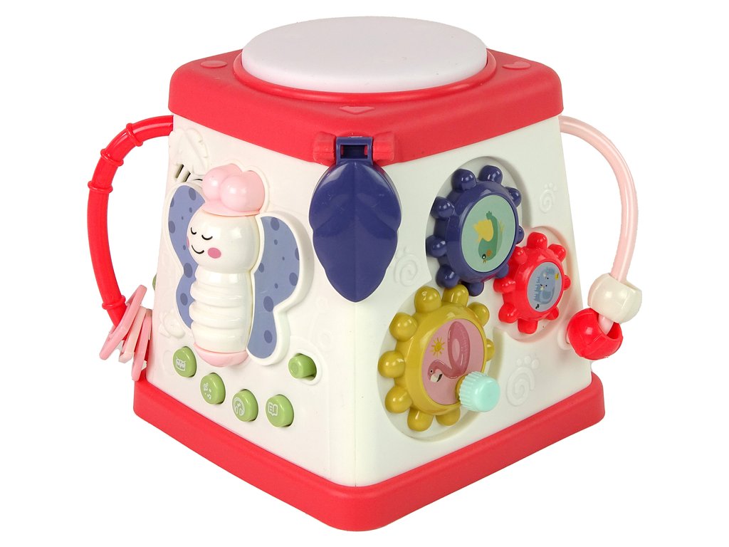 Barevná interaktivní kostka se skládá z několika hraček spojených do tvaru kostky, která svými přátelskými barvami povzbudí ke hře každé batole. Každá stěna kostky má jiné, překvapivé funkce. Zvukové a světelné funkce budou stimulovat jeho sluch a zrak. Pestré barvy a design upoutají pozornost batolete, úsměv z tváře vašeho dítěte nikdy nezmizí.