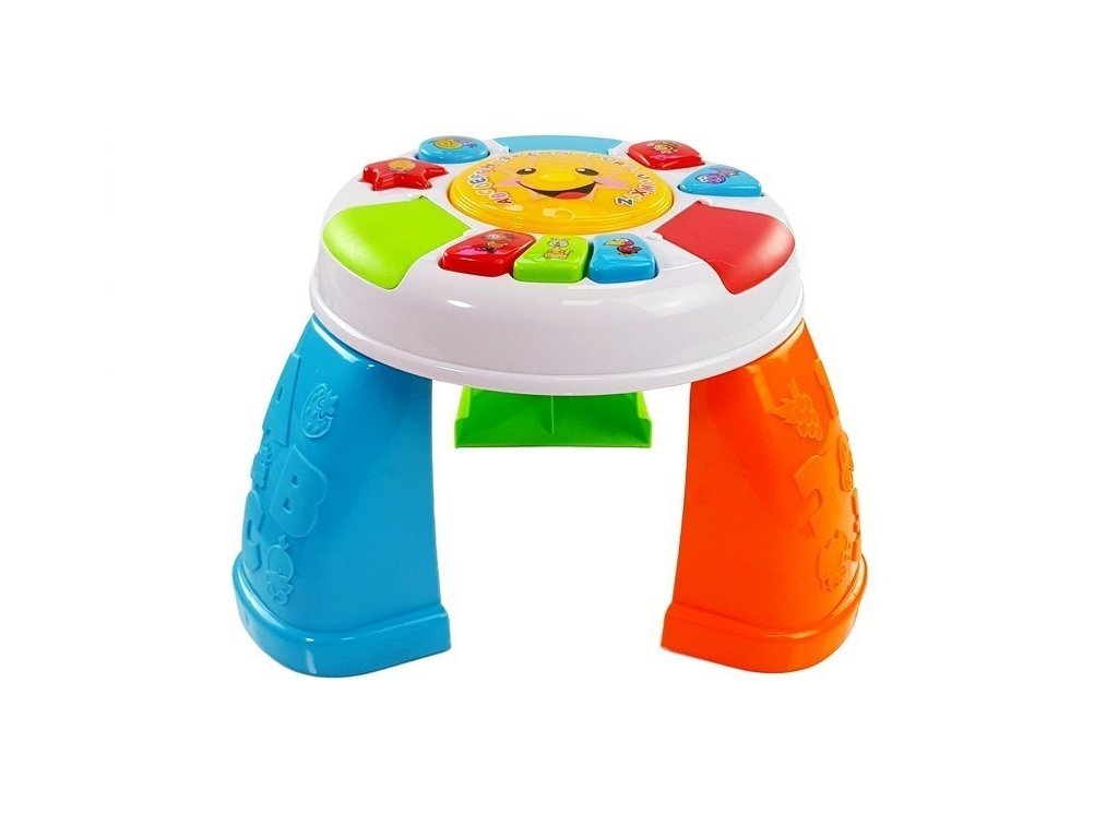 Na povrchu stolku najdeme tlačítka ve tvaru trojúhelníku, čtverce, kruhu a hvězdičky, které spustí upoutavé zvuky. Ve střední části je velké kulaté tlačítko se sluníčkem, které po stisknutí vyvolá smích a zvuky bicích nástrojů a melodií. Hned u kraje je malý klavírek se třemi tlačítky s obrázky zvířátek.