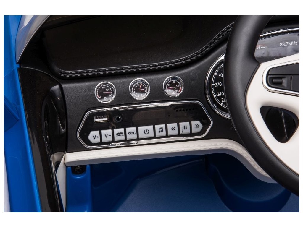 Interiér autíčka je vybaven vstupy MP3, USB, SD, a tlačítky s melodiemi. Na cestu si posvítíte předními i zadními LED světly.
